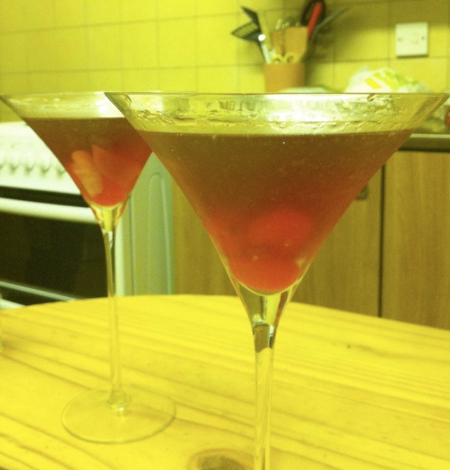 Pour ingredients over ice, stir. Taste (this is the time to make any changes to adjust the taste if you want to!). Pour into chilled martini glasses, I find a cocktail cherry helps at this point!!