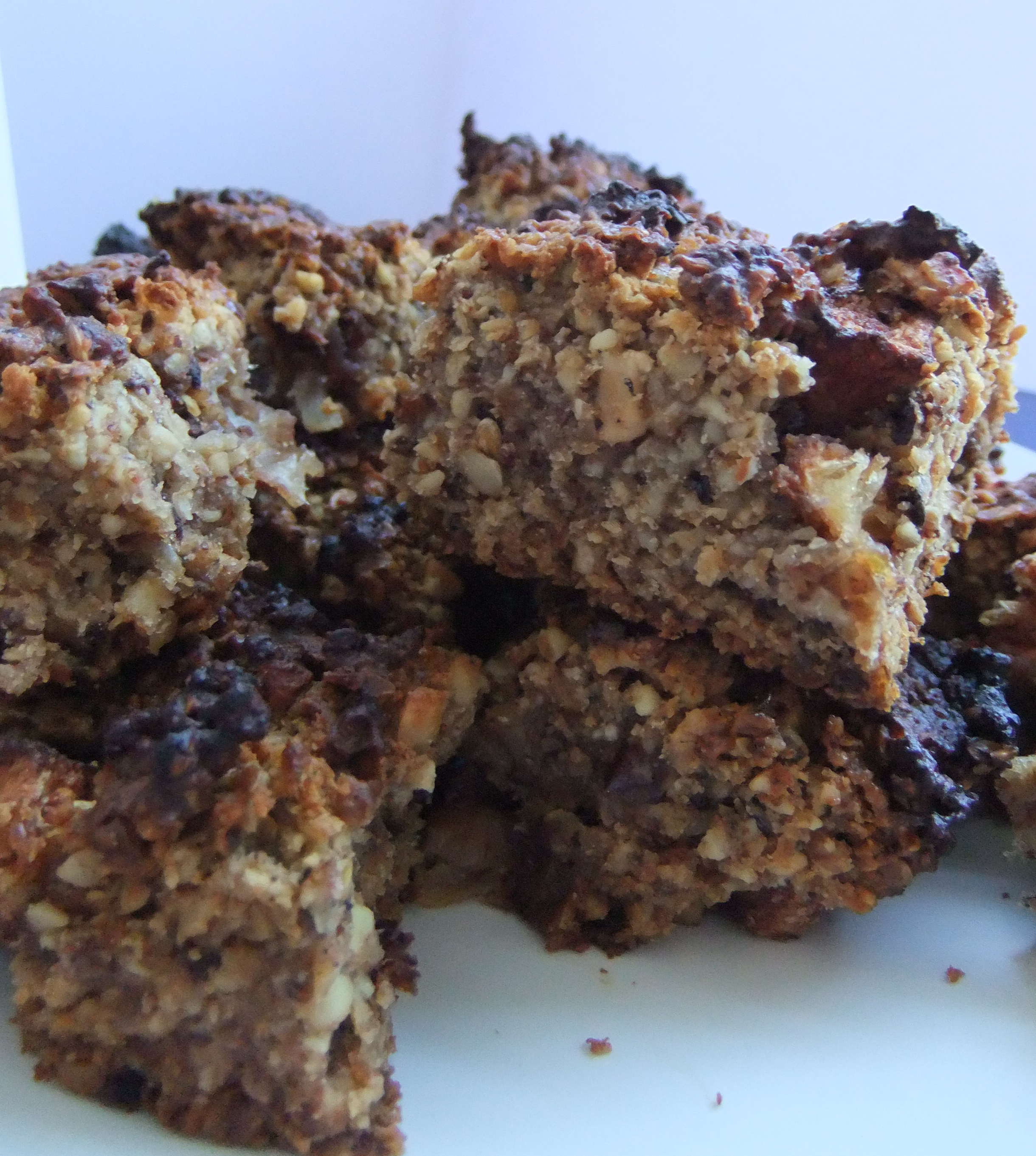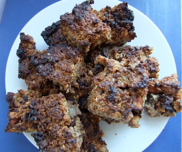 The recipe for Apple and Cinnamon Granola Bars seemed to fit the bill. I had a go and they were, I sent some to Christine and ate the rest over the course of the week. For breakfast with raspberries and one after lunch as a treat. So I made them again and of course they got some adjustment. I upped the amount of apple from one to two, added more cinnamon and a little bit of ginger. As I was making them, I ran out of agave (the recipe called for 150ml), so I used what I had and subbed with honey.