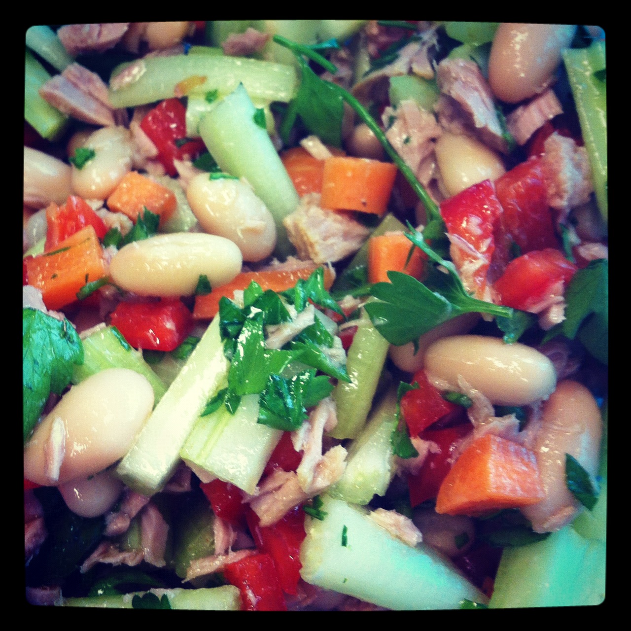Some things to bear in mind, tins are different sizes, I’ve measured the ingredients drained, so if in doubt get out your scales. Chop the vegetables so it’s bite size for you, I like them to be about the same size as the beans. A pot for dressing is useful, if you don’t have a lunchbox like mine, an empty herb jar works really well.