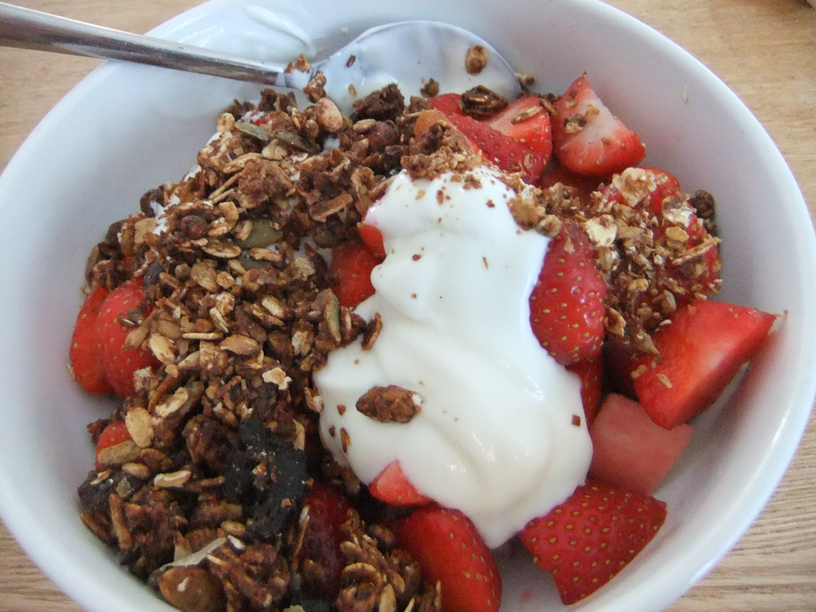 Fruit, granola and greek yogurt. You can’t see it in this photo but there’s a chopped up apple in there. The yogurt is full fat because I’m not keen on hidden sugar and I made the granola and dialled back on the sugar by using less and using agave instead of honey. It is quite sugar happy, however, I’ve noticed that if I eat the sweet stuff at the beginning of the day I’m less likely to have the afternoon ‘I need something bad for me and I need it now’ munchies. Anyway it works for me.