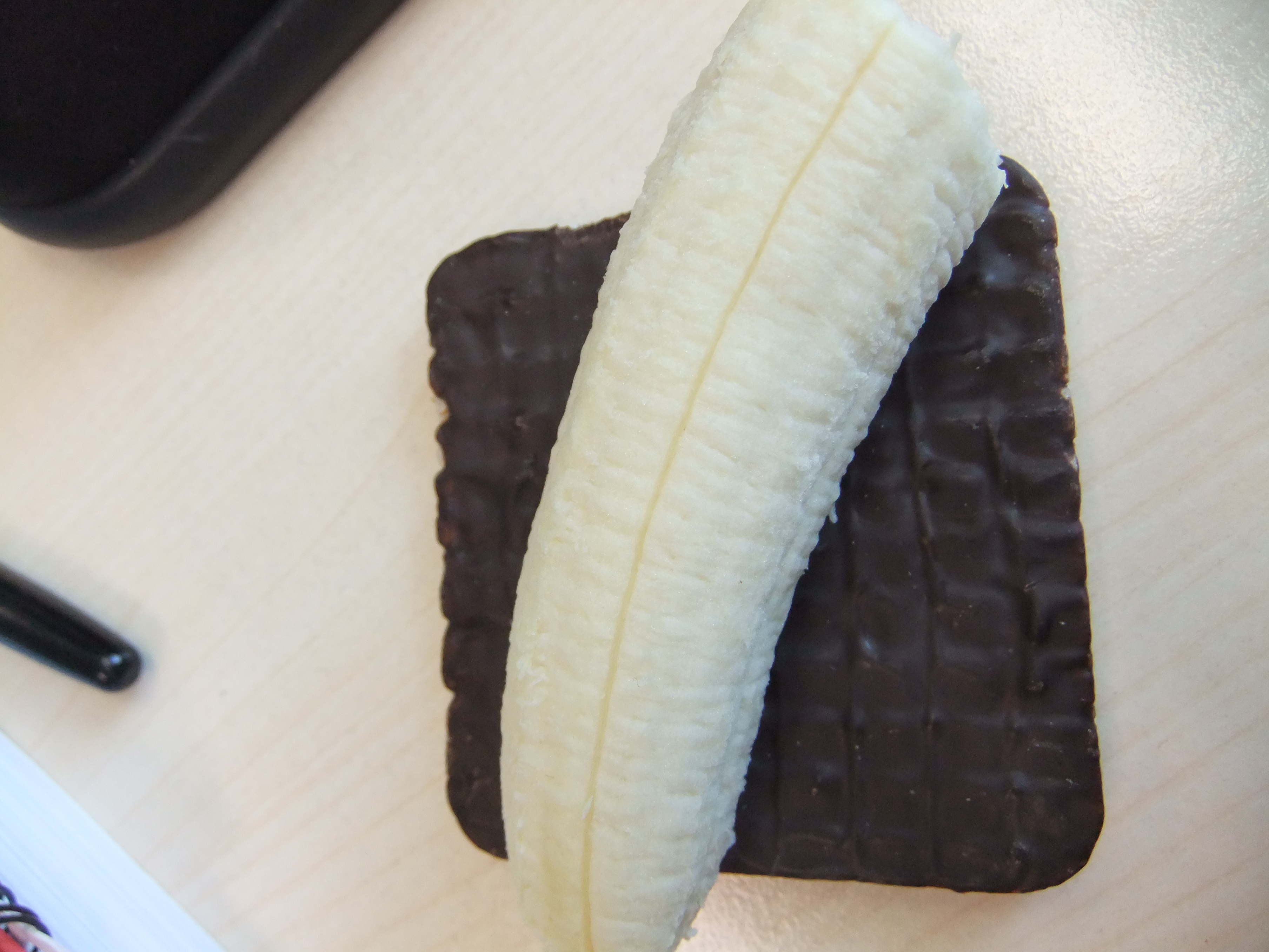 Banana and a dark chocolate covered rice cake.