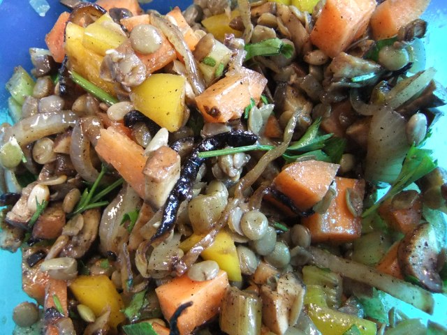 Lentil Salad – Lentils, sautéd onion, celery and mushrooms, with a chopped up carrot and half a pepper. Oil and balsamic dressing (3 teaspoons vinegar, 3 teaspoons olive oil, salt and pepper)