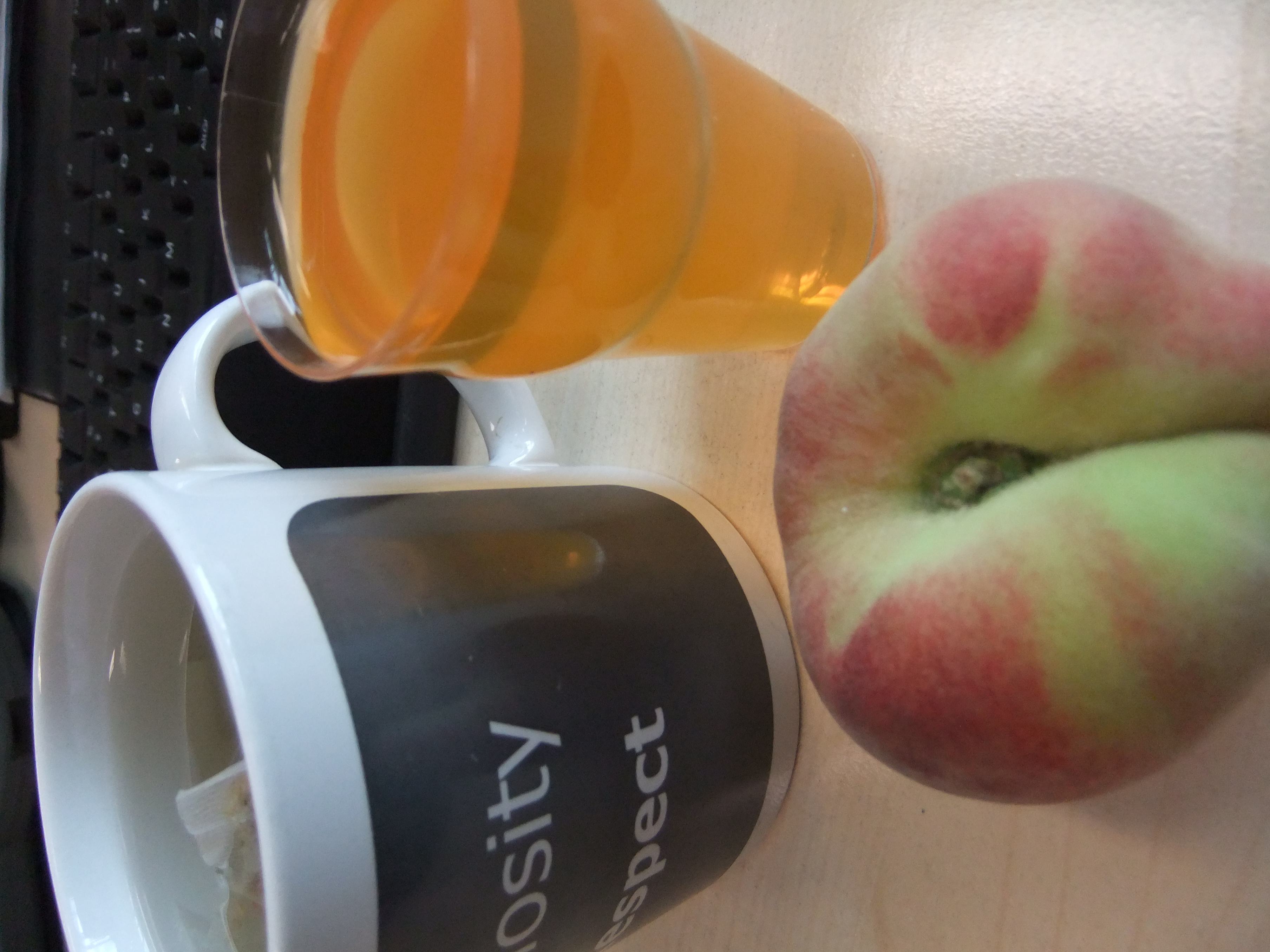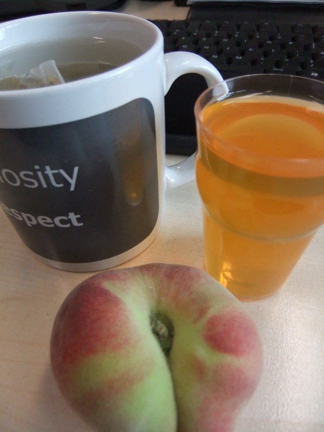 A peach, an orange sugar free jelly and lemon and ginger tea. I love jelly have taken to making up pint for when I want something sweet. I pint makes six of the little pint thingies are are perfect for lunch dessert!