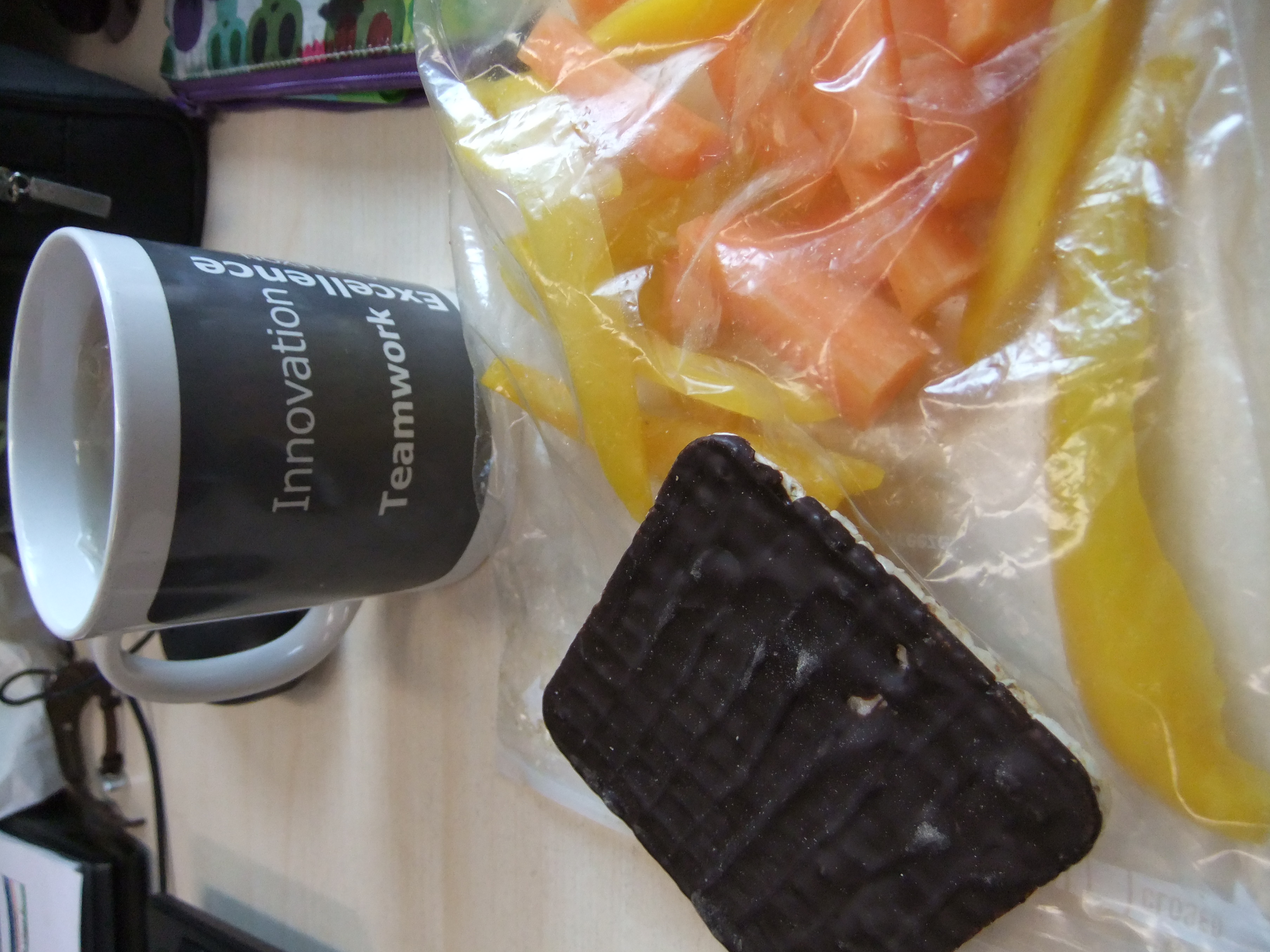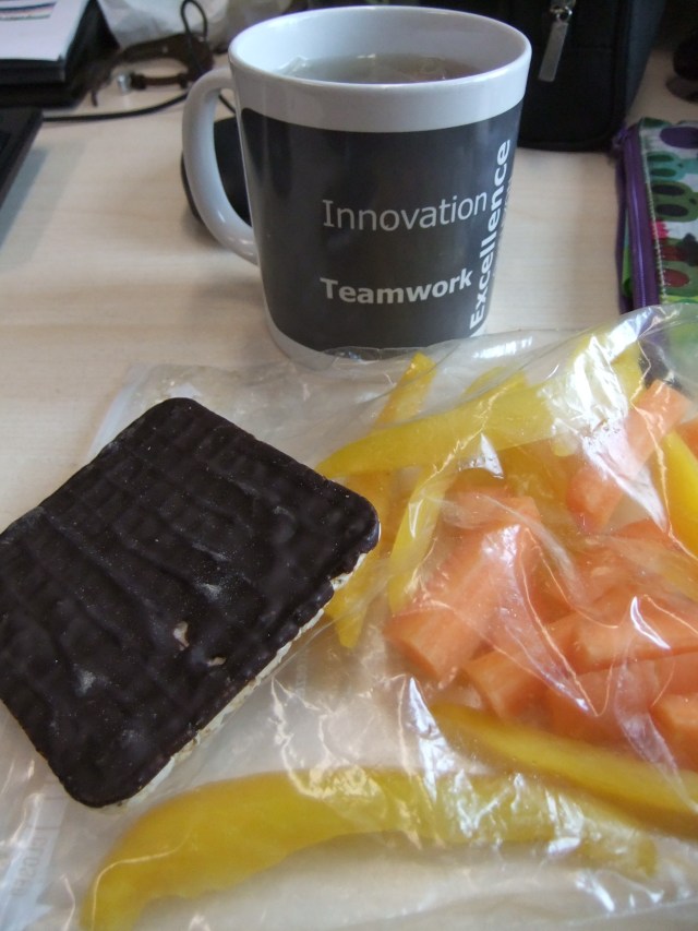 A carrot, half a pepper, another chocolate rice cake and more lemon and ginger tea. I’ve been eating more fruit recently (we get free fruit at work on Monday and Wednesday) I’m trying to cut back a bit and make my afternoon snack a vegetable based one.