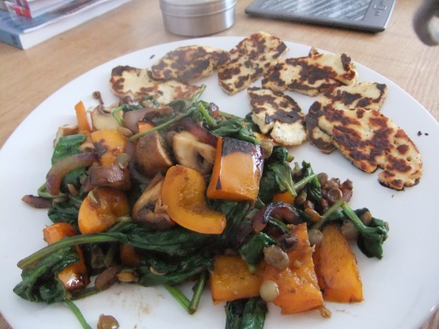 Stir fried mushrooms and peppers with lentils and spinach, grilled haloumi cheese. I love lentils and cook some at the beginning of each week to keep in the fridge, that way, I’m never that far away from dinner or an easy packed lunch. This was lovely and I will be eating it again.
