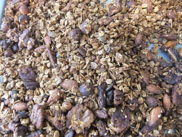 3) Spread the mixture on a baking sheet (or several if you have small baking trays!) and bake on a 170°C until the granola is golden, turning halfway through. In my oven this is about 20 to 30 minutes but my oven runs hot but keep an eye on it.