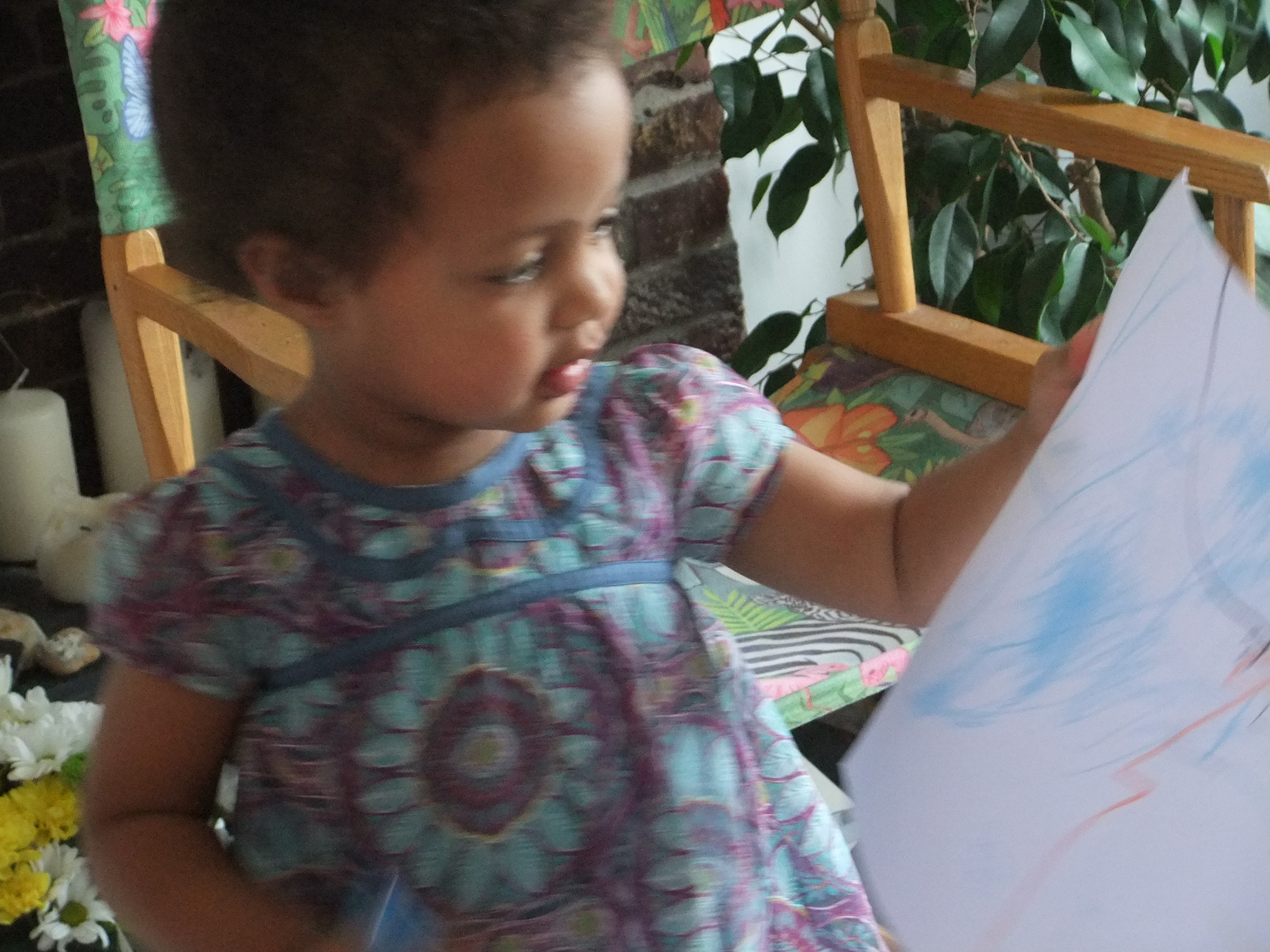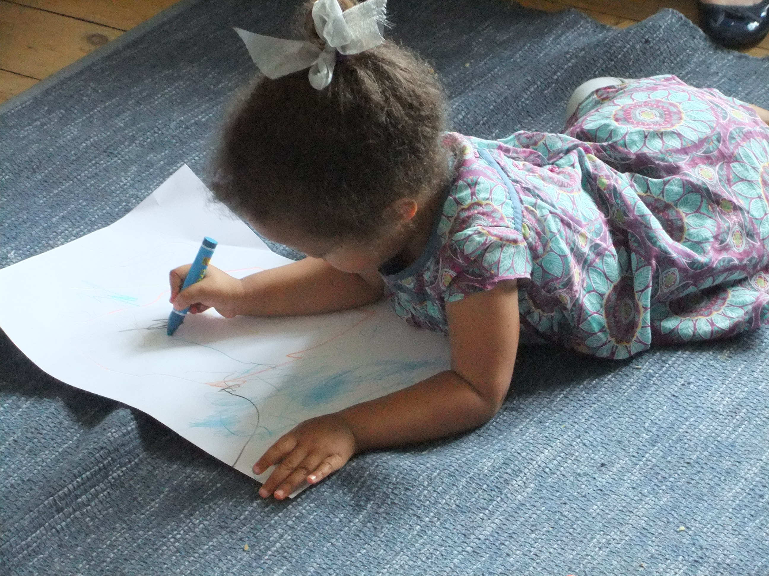 Tabitha drawing a dog “with two eyes, two eyebrows and a tail”