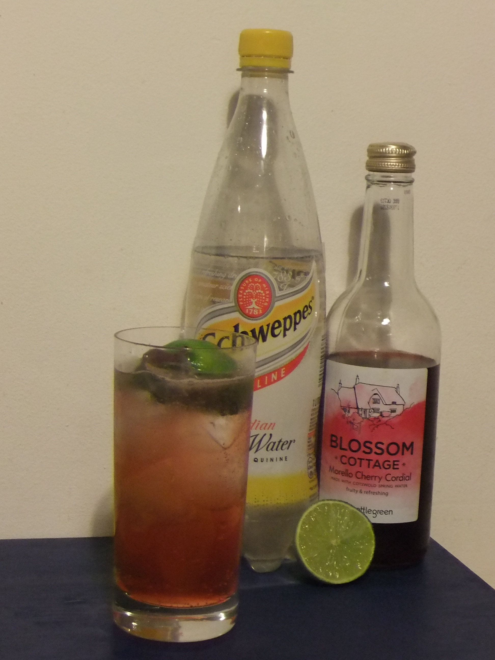 I’m very taken with the Morello Cherry Cordial by Bottlegreen, which I’ve used before in an alcoholic cocktail, the Cherry Beer, it’s good and I’ve been drinking it with fizzy water. However, last Friday, I forget to get any fizzy water and used tonic. I often drink a G&T minus the gin so using lime seemed to be the way to go.