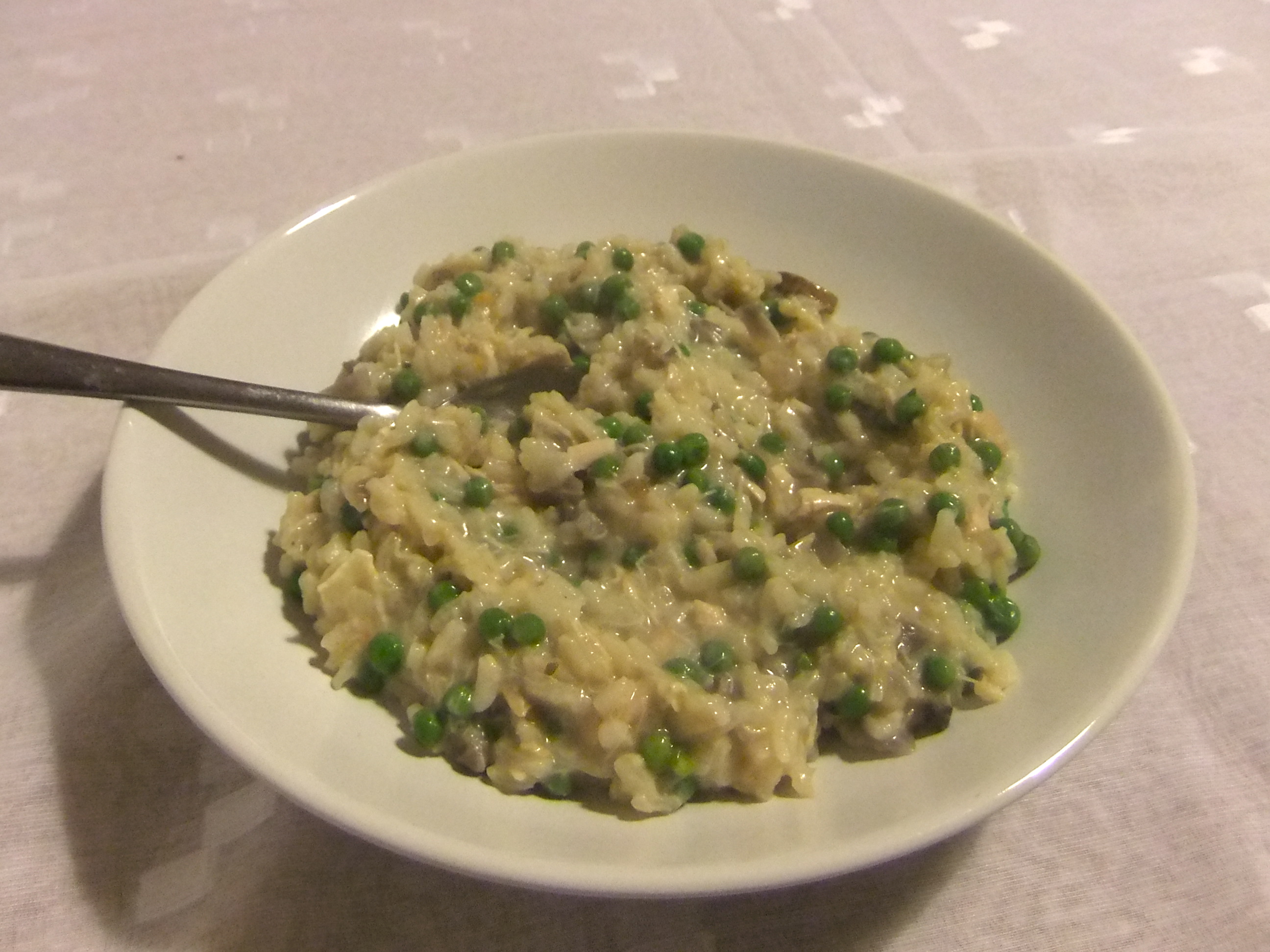 There was a packet of arborio rice that needed using up lurking in the cupboard and some chicken left over from a roast. So it was time to make some risotto. Generally I think that risotto should be kept simple but it’s easy to get carried away and add loads of stuff to it. I started this one off with chicken, onion and mushrooms but decided that it looked a little beige, so threw in some peas at the last minute to add some colour. It’s not too overloaded and tasted really good.