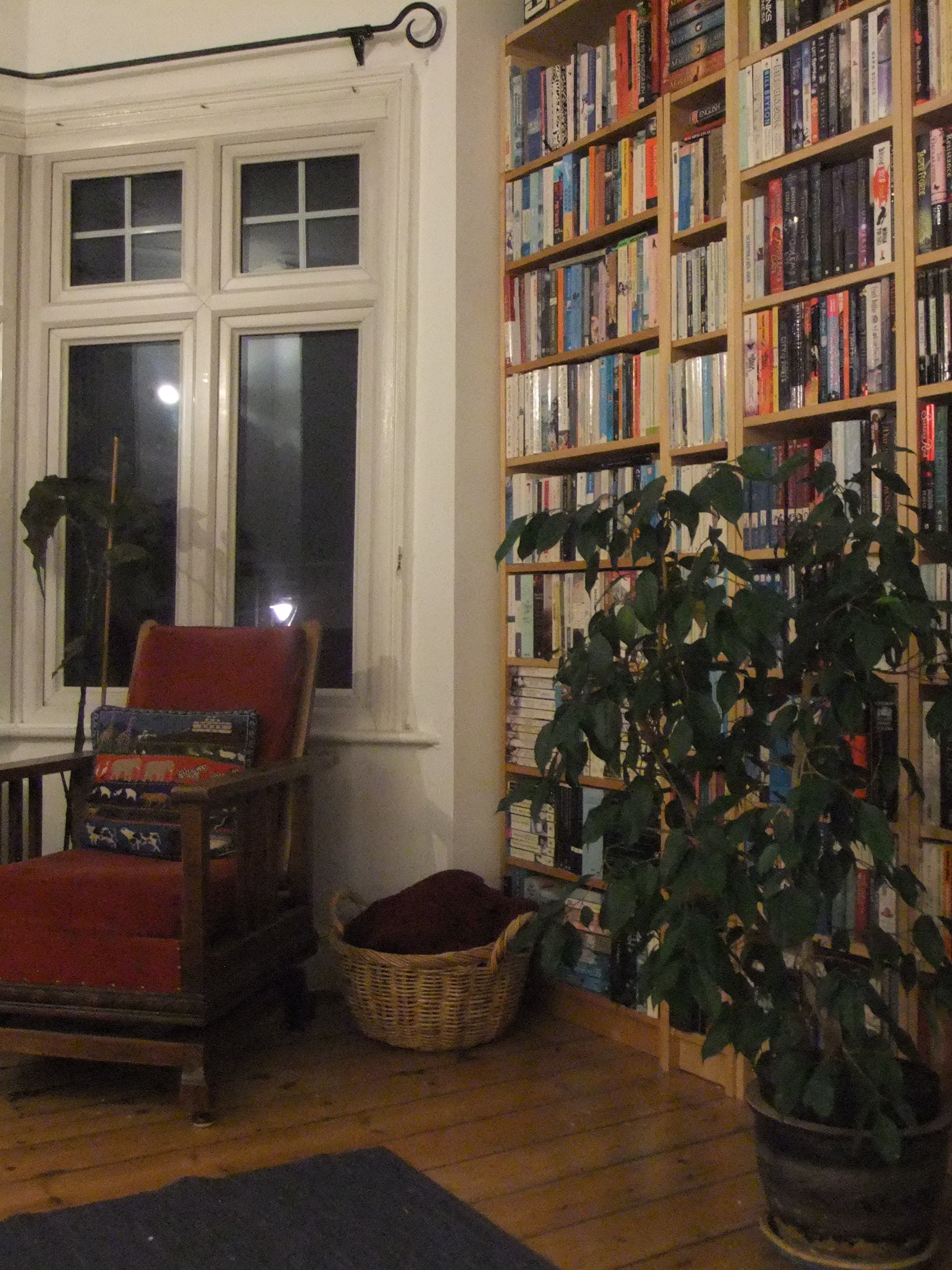 As far as I’m concerned walls can come in any colour provided that colour is white. Not beige, not magnolia (which fades really badly) but white. I understand that people think this is boring, but the living room has brown floors, a red brick fireplace, red chairs, pictures on the walls, lots of books on shelves and two pretty big plants. I think that’s enough colour.