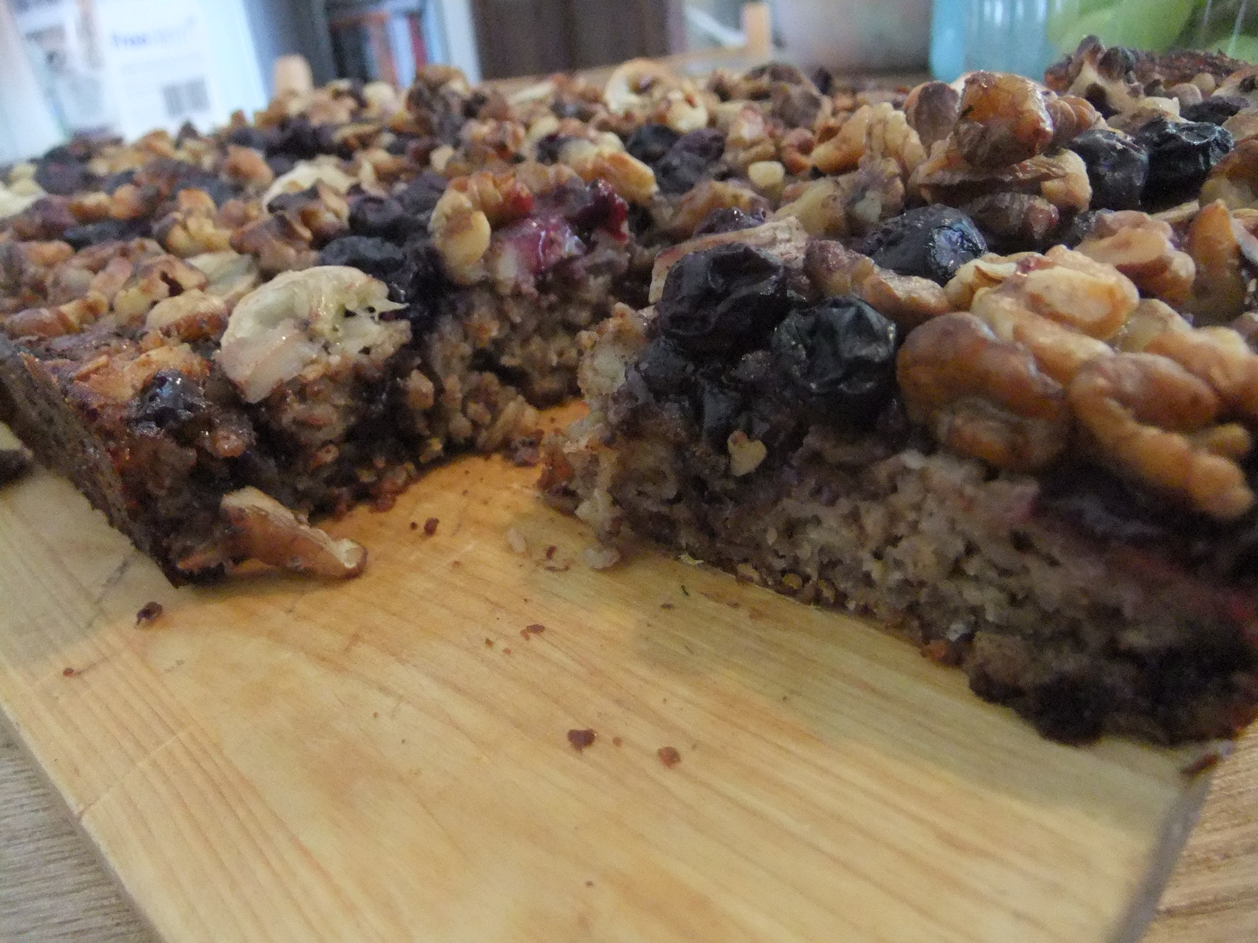 I saw this and it looked like a solution, it’s one of this week’s new recipes. The original recipe is here and I’ve changed it slightly (don’t really do almond milk, I ran out of maple syrup and blueberries and cherries are my frozen fruit of choice!) it’s been great for breakfasts as I’ve just packed it with my lunch and eaten it at my desk with a piece of fruit. Next time, I’ll use less walnuts and maybe add some seeds to it, I’m also thinking that I’ll leave out the chocolate and maybe put some dried fruit in it to make it feel more like a breakfast food.