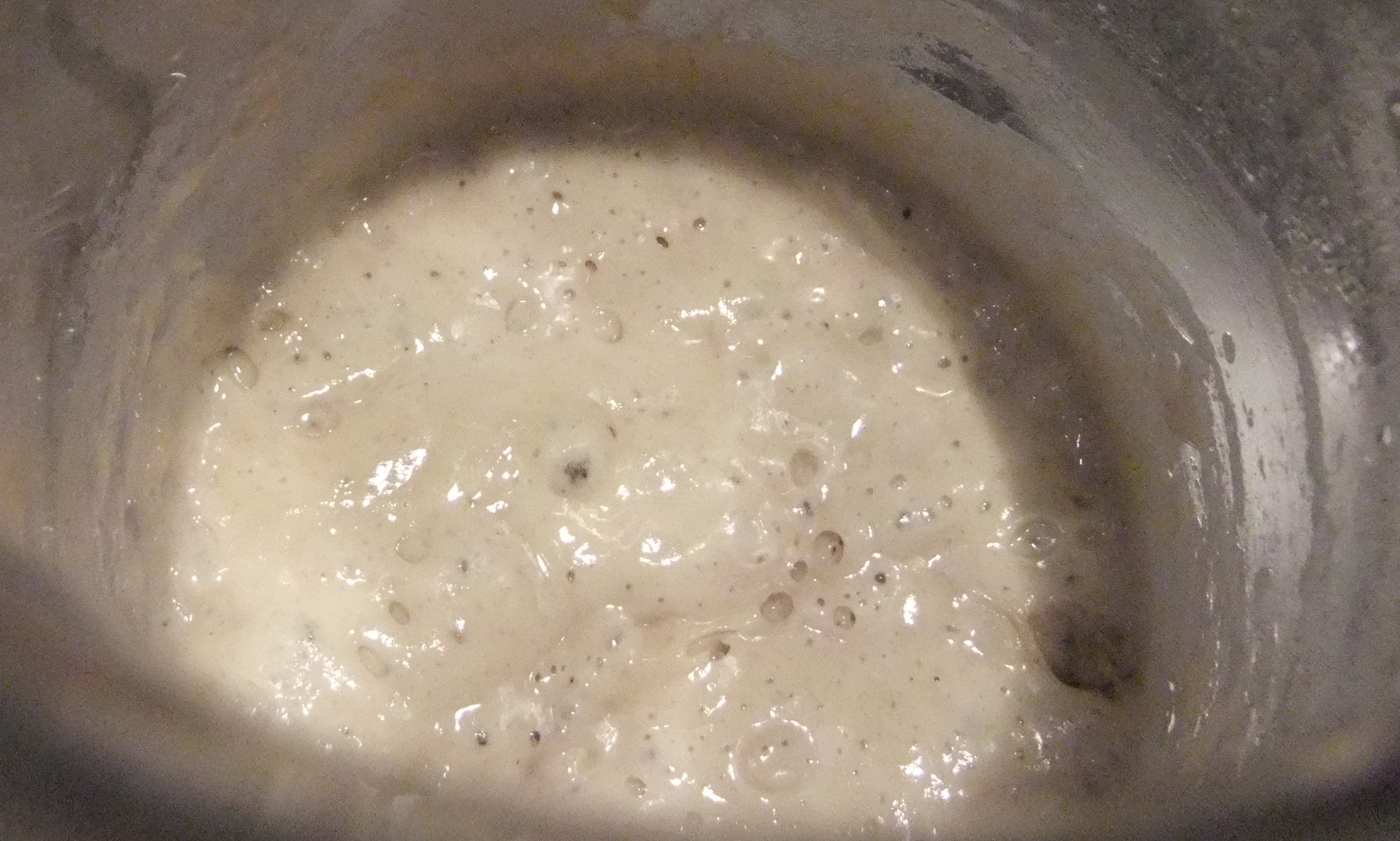 On Saturday morning at about 8am, I took 150g of my starter, added 250g of strong white bread flour, mixed it together and left it for the day.