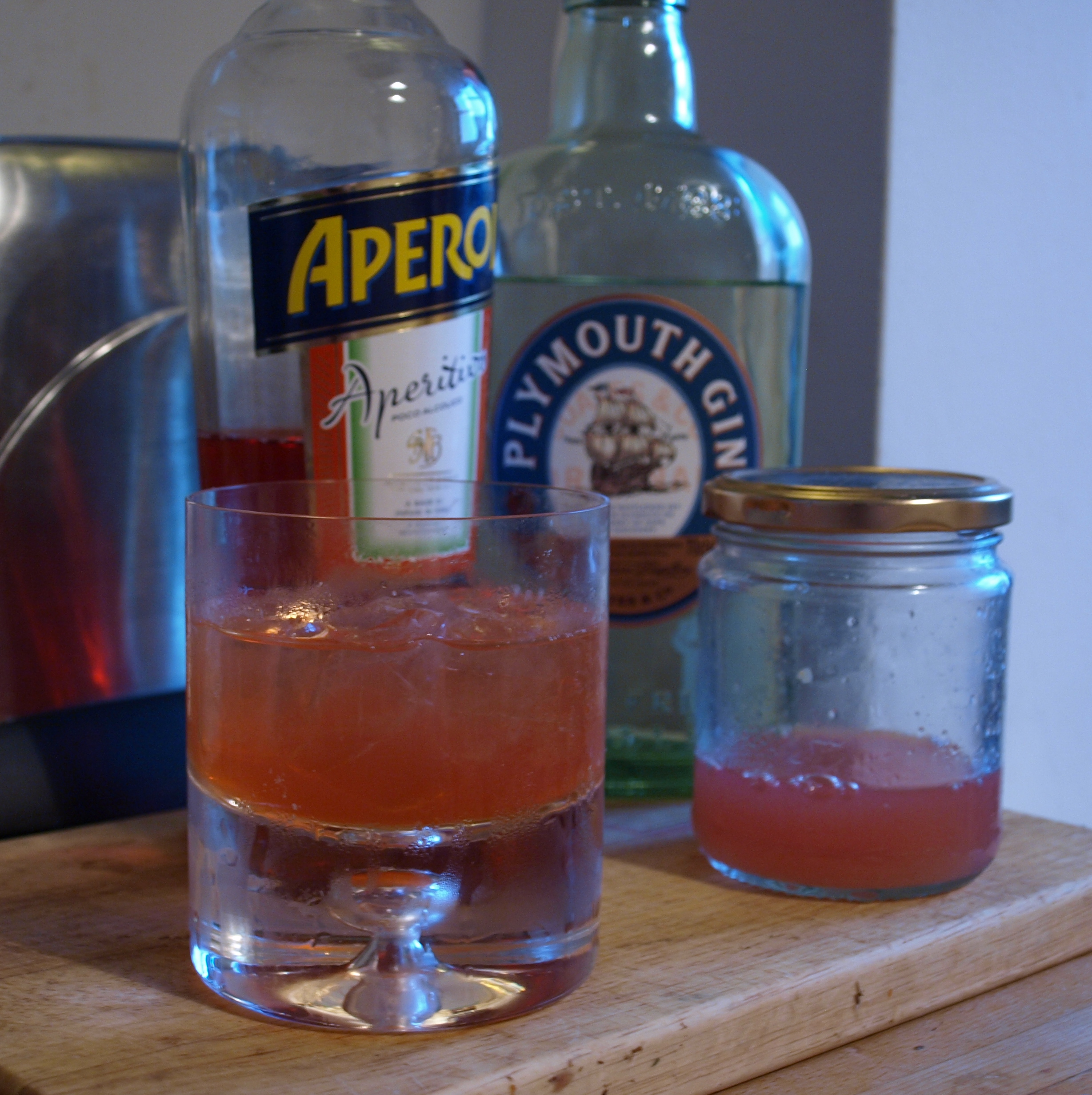 My love of cocktails is matched only by my laziness and hatred of washing up. So things I can make in a one glass are a thing of beauty, especially on Friday nights! This drink isn’t my idea, it was godchild number 3 (Luc). There is rhubarb in his garden and he made a rhubarb syrup from Small Adventures in Cooking to drink with fizzy water. He had us try this and mentioned that it’s actually for adding to a G&T. Which got his grandfather thinking and there was no tonic (which is quite shocking) so we did without and added a tiny bit of Aperol. Luc didn’t get to taste but we all thought it was rather good.