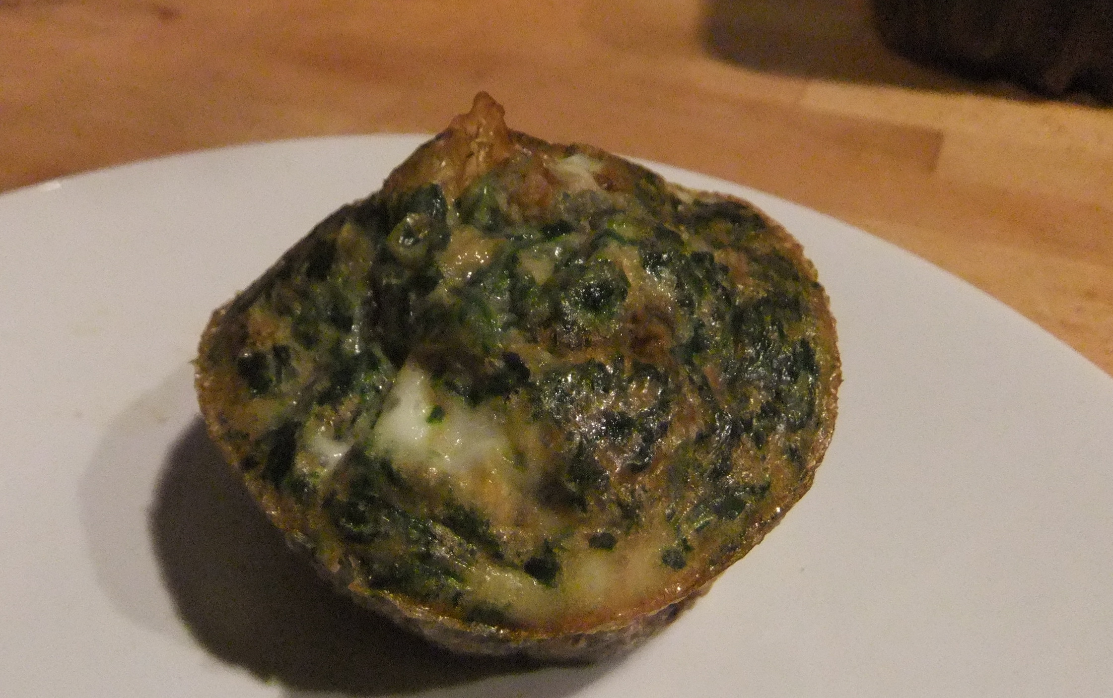 This change of diet has increased the amount of beans and eggs in my diet. I’ve been trying to avoid substituting cheese for meat as I eat quite enough cheese as it is! I love eggs and eat loads of them, in the morning, they can be poached, scrambled with lentils, and most often, for a weekday breakfast eaten hard boiled or like as eggcups like this although minus the goats cheese. Which means they have meat and processed meat at that. I think it’s a good idea to keep my diet as unprocessed as possible, so I wanted something that worked as well for quick and easy breakfasts. While I was at it, if I could up the vegetable content, so much the better and this is what I came up with. My idea was a sort of mini frittata and the vegetables that came to mind were mushrooms and spinach.