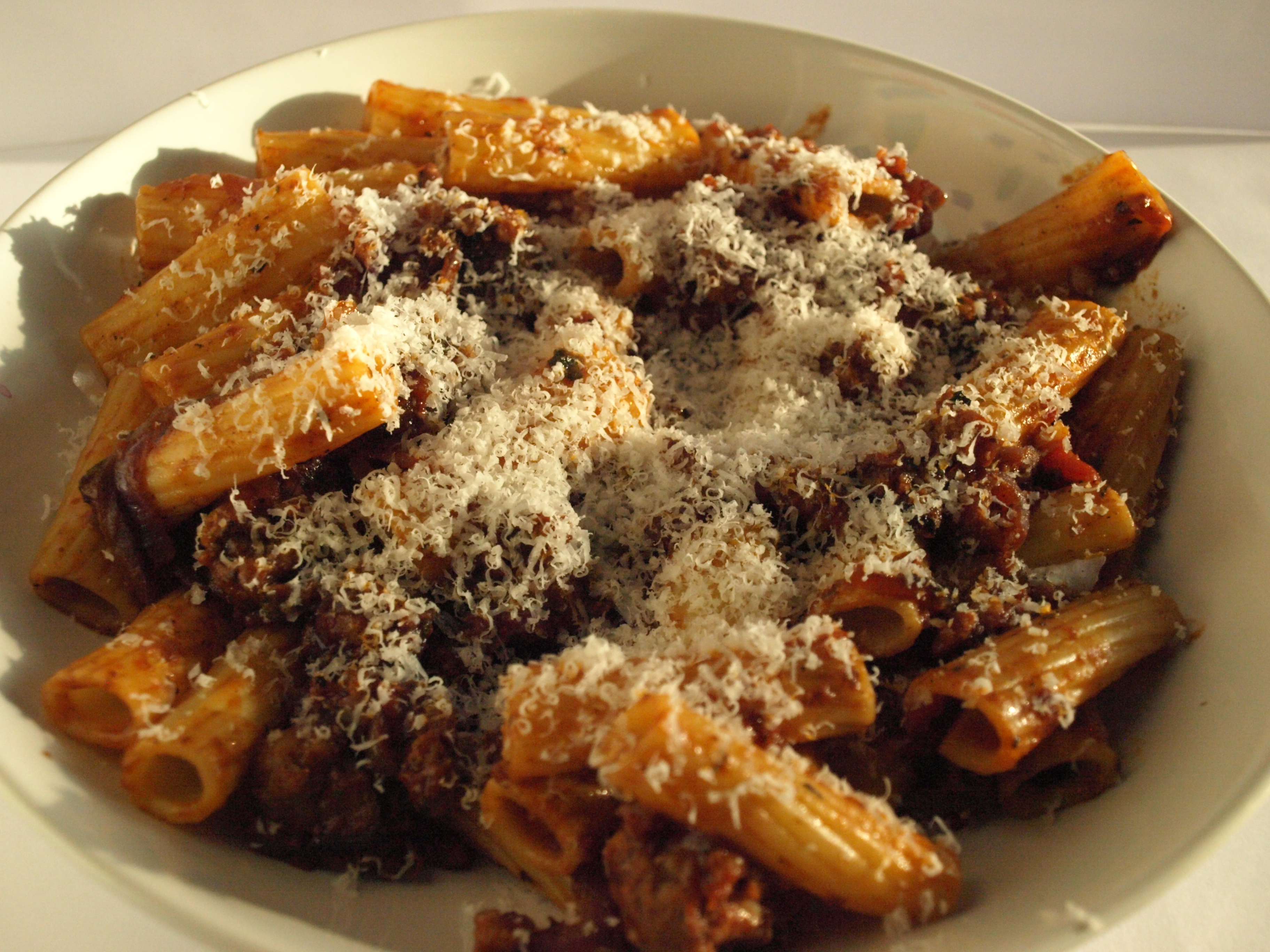 Add tomatoes, wine and vinegar and reduce heat. Simmer until the sauce has cooked right down and then add the cooked drained pasta.