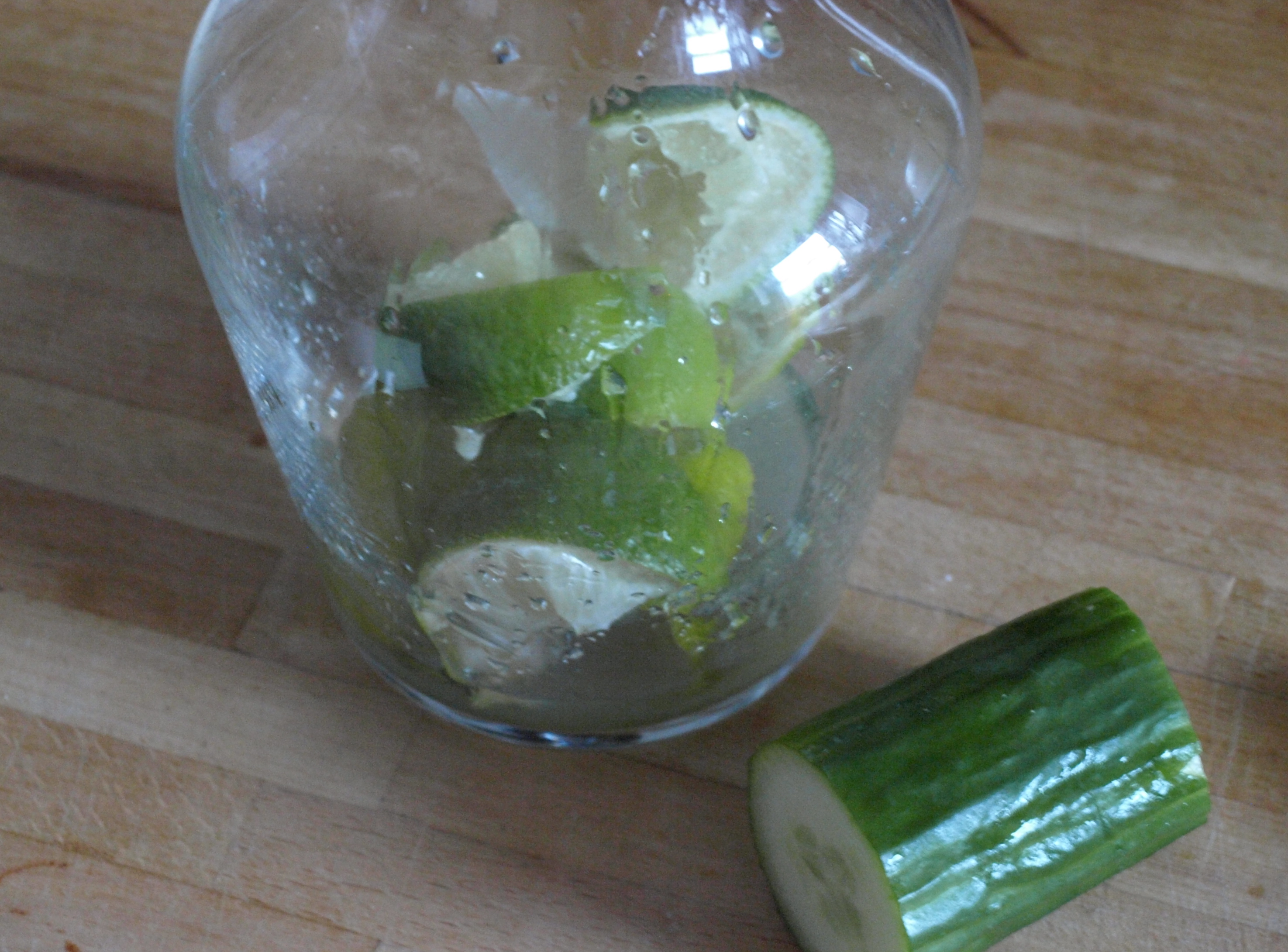 Squeeze the lime quarters into the carafe and drop the limes in. Thinly slice the cucumber (I use a vegetable peeler) and add to the carafe.