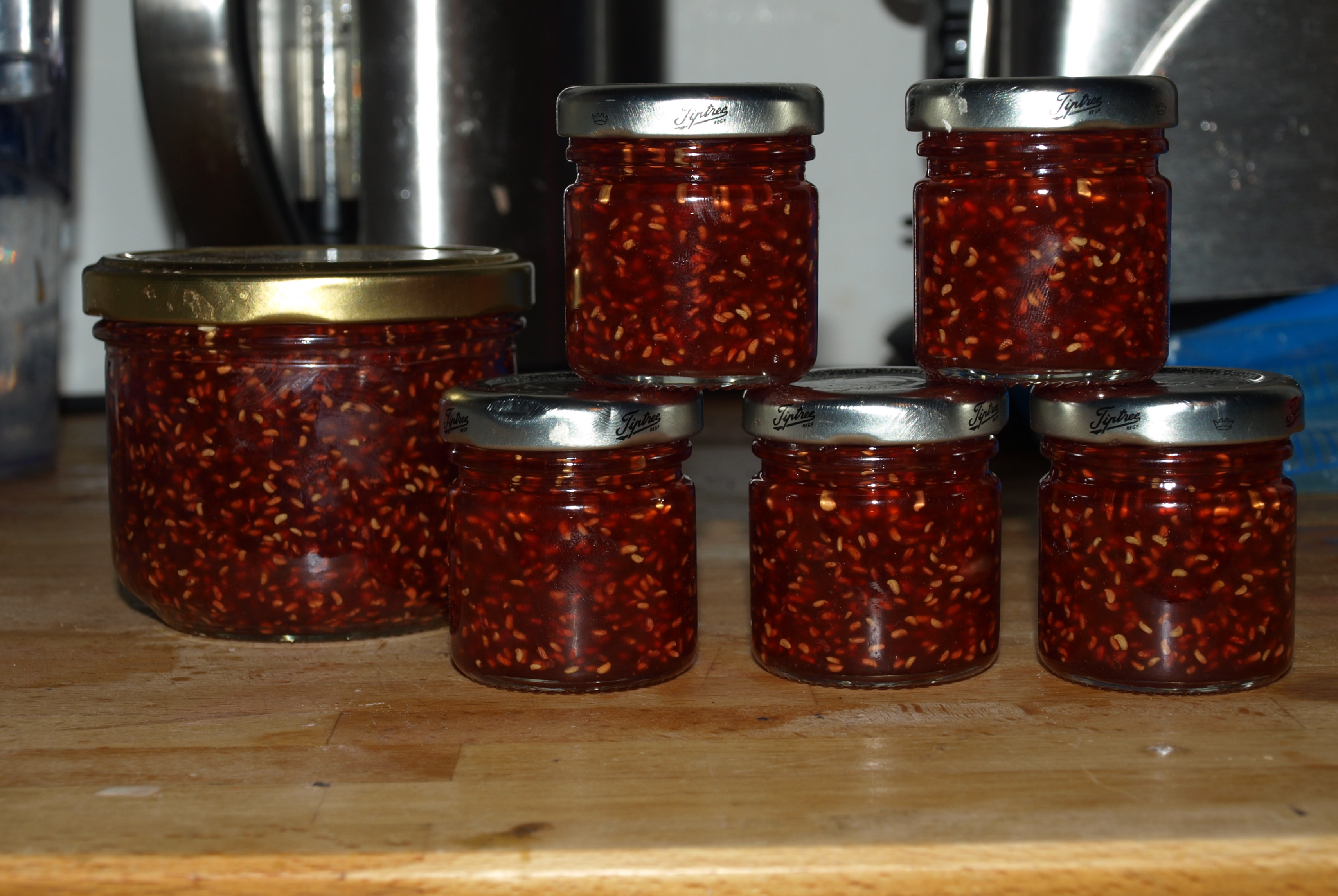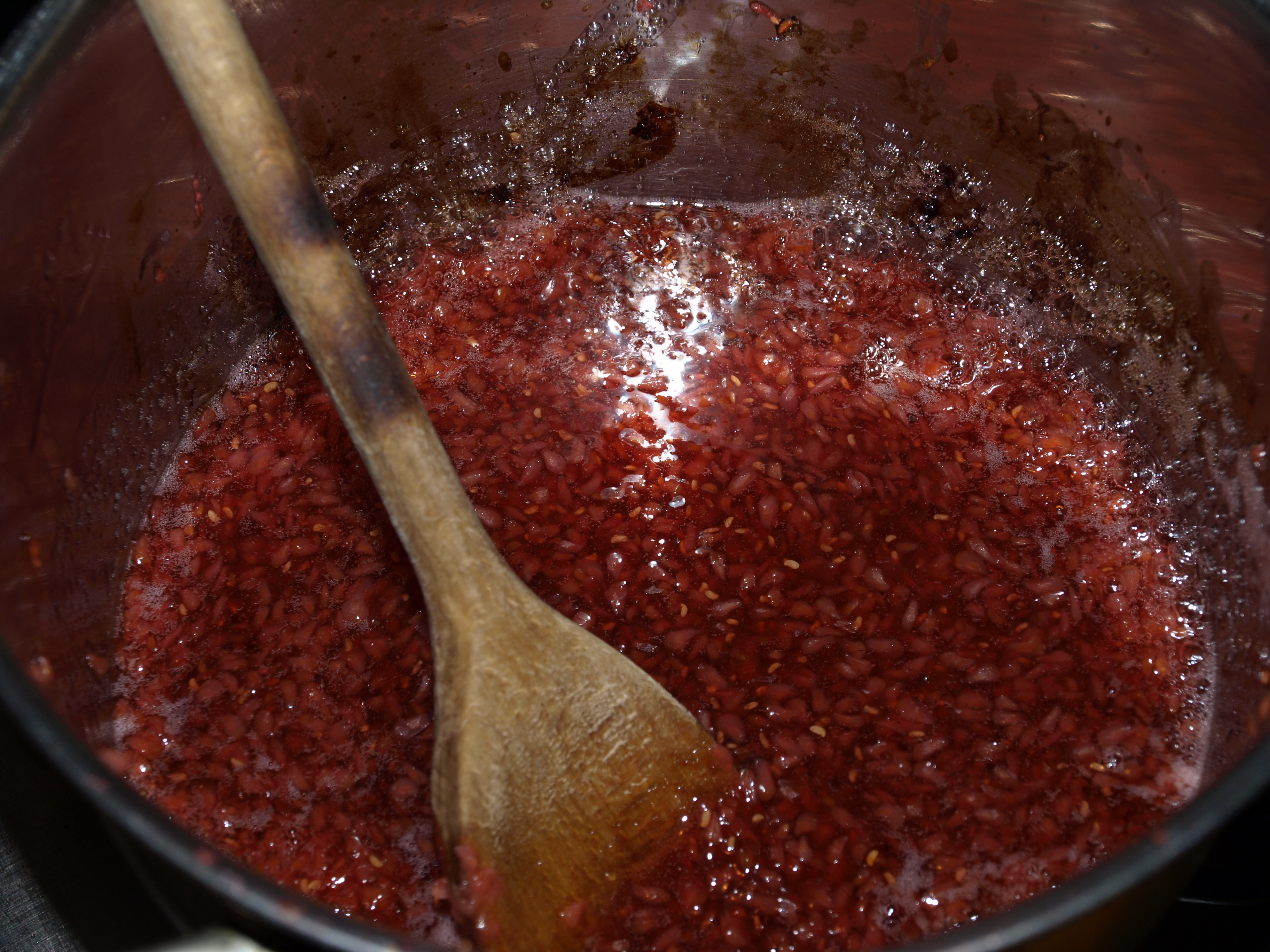 It’s a beautiful colour and from it I got a 70cl bottle and 7 miniatures (50ml). Then I was left with the problem of what to do with now slightly bleached of colour raspberries. I had seen somewhere that you should just pour a bottle of sherry over them and start again but I was leaning towards jam. I didn’t make any jam this summer and other than what’s in the fridge and the jar of plum jam that Charles gifted me with at the weekend, I have no jam stored. I also had a kilo of jam sugar in the cupboard so jam it was!