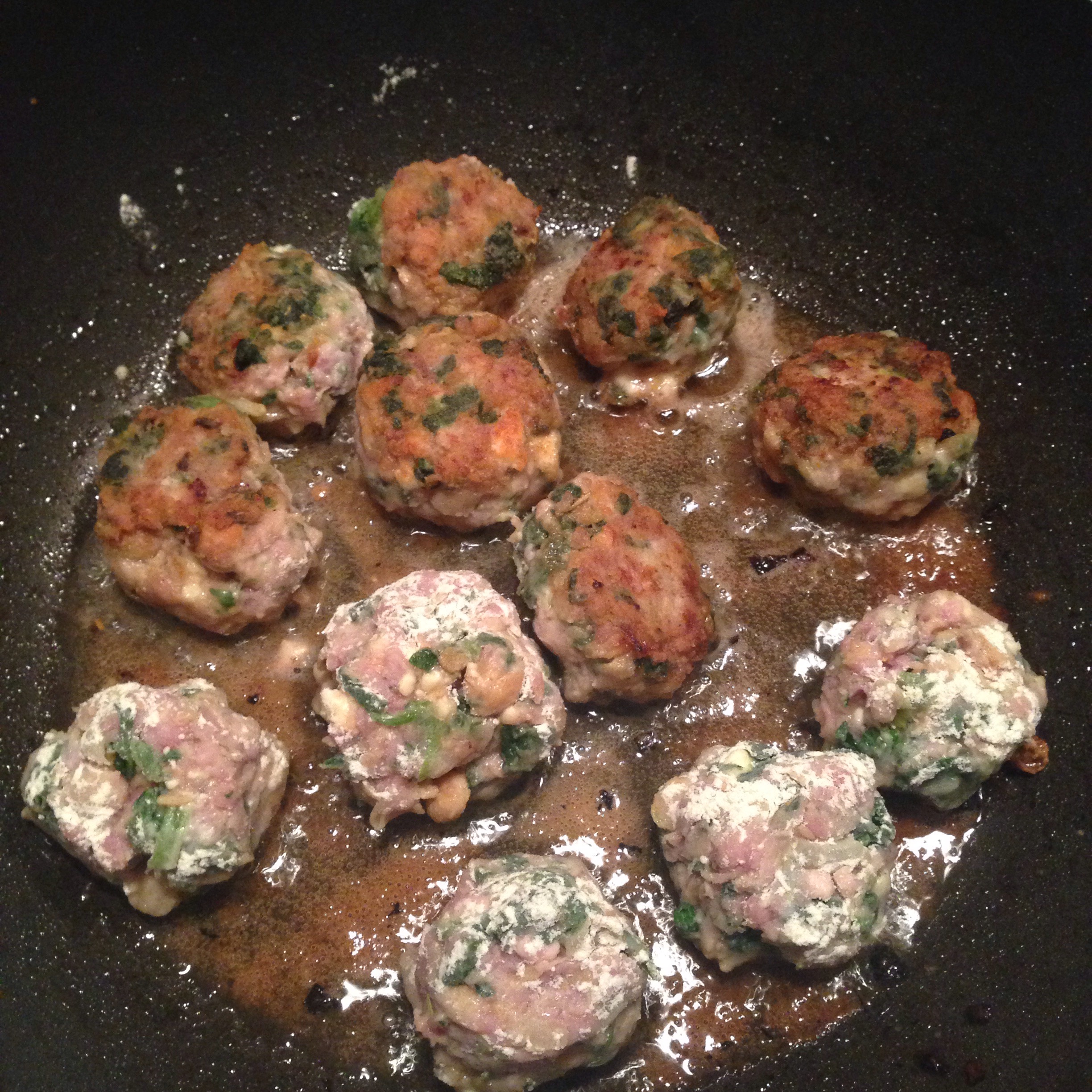 5) Add about a tablespoon of oil to a large pan, and in batches, brown the meatballs. Adding more oil as you go if required.