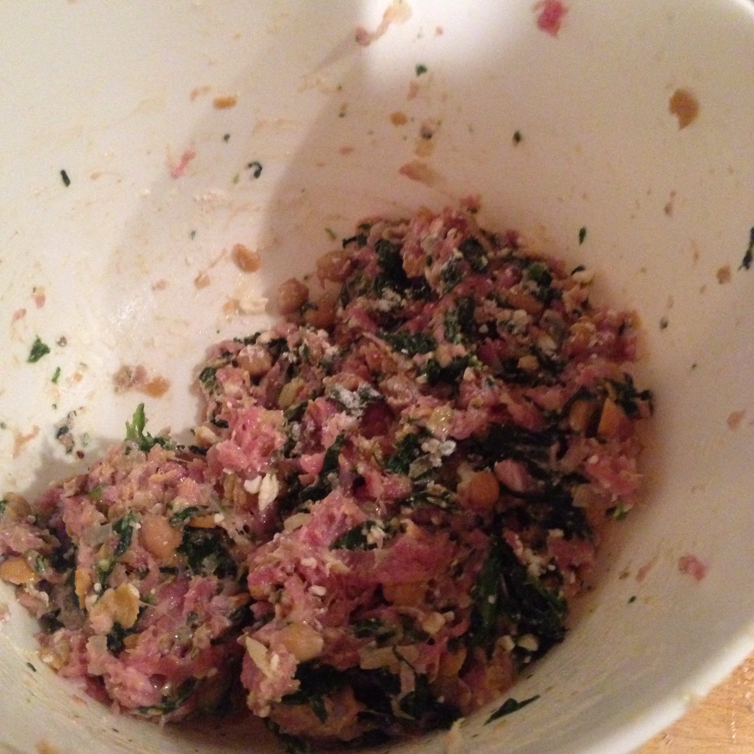 3) Add the cooked onions and garlic, turkey, chickpeas, egg, spinach, feta and herbs to a large bowl and mix together. (I use my hands)