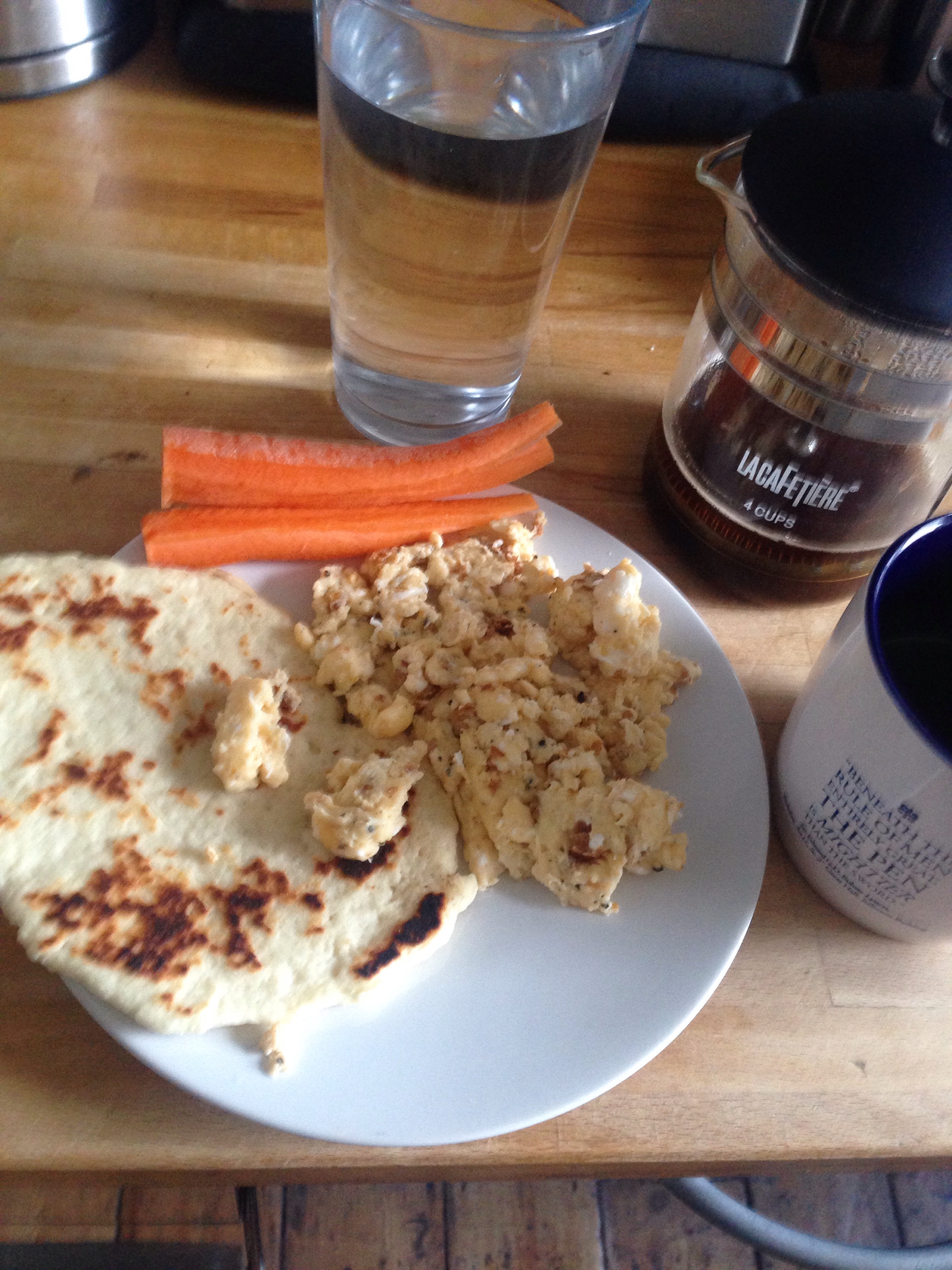 That done, I was ready for work lots of time to spare so I had breakfast at home and had scrambled eggs with a flatbread and the carrot that didn’t make it into my lunch box. Another pint of water and the rest of the coffee.