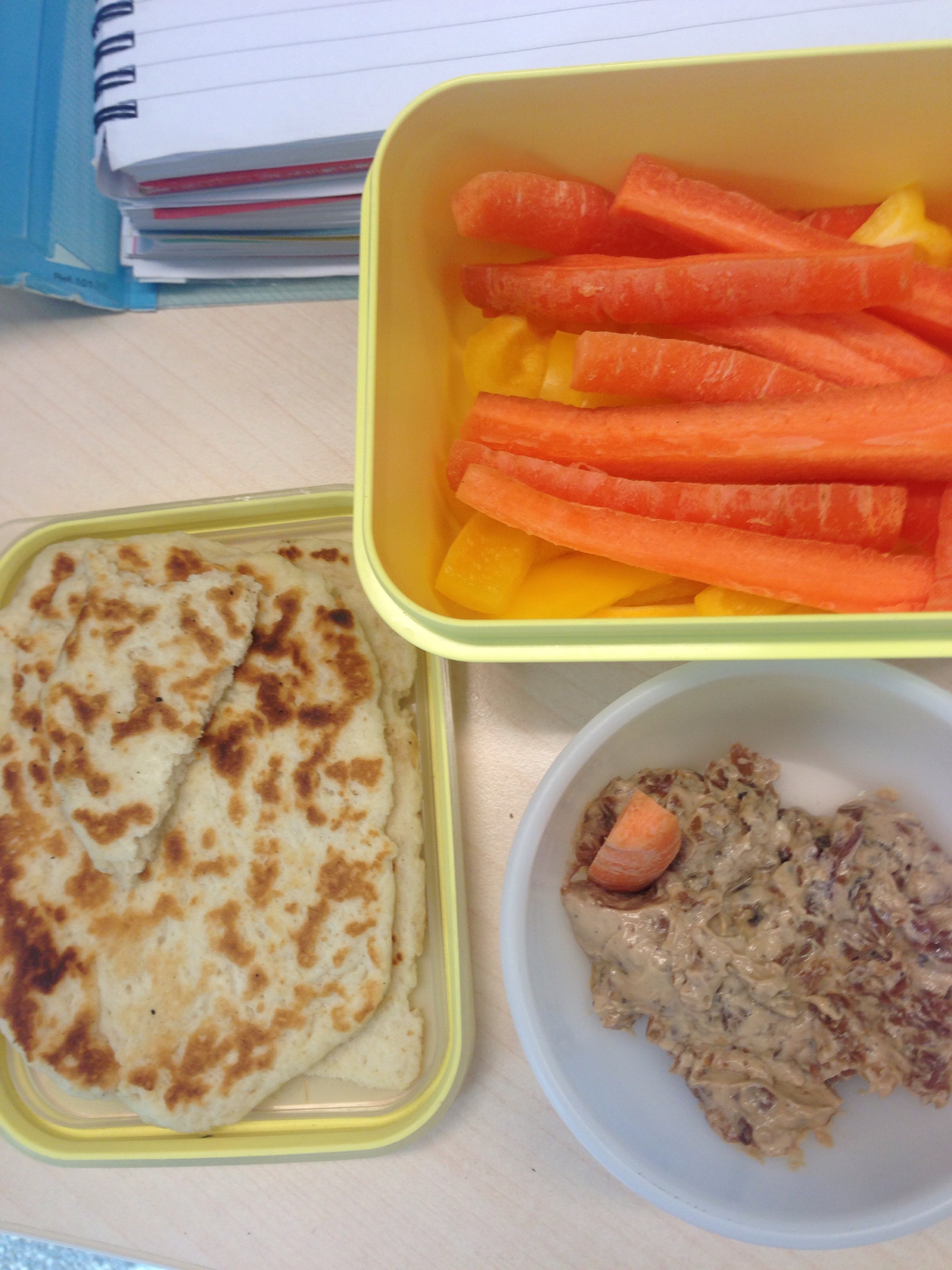 Lunch was caramelised onion dip based on this recipe from Cassie at Back to Her Roots (mine has more onions, less mayo) with flatbreads and carrots and a yellow pepper.