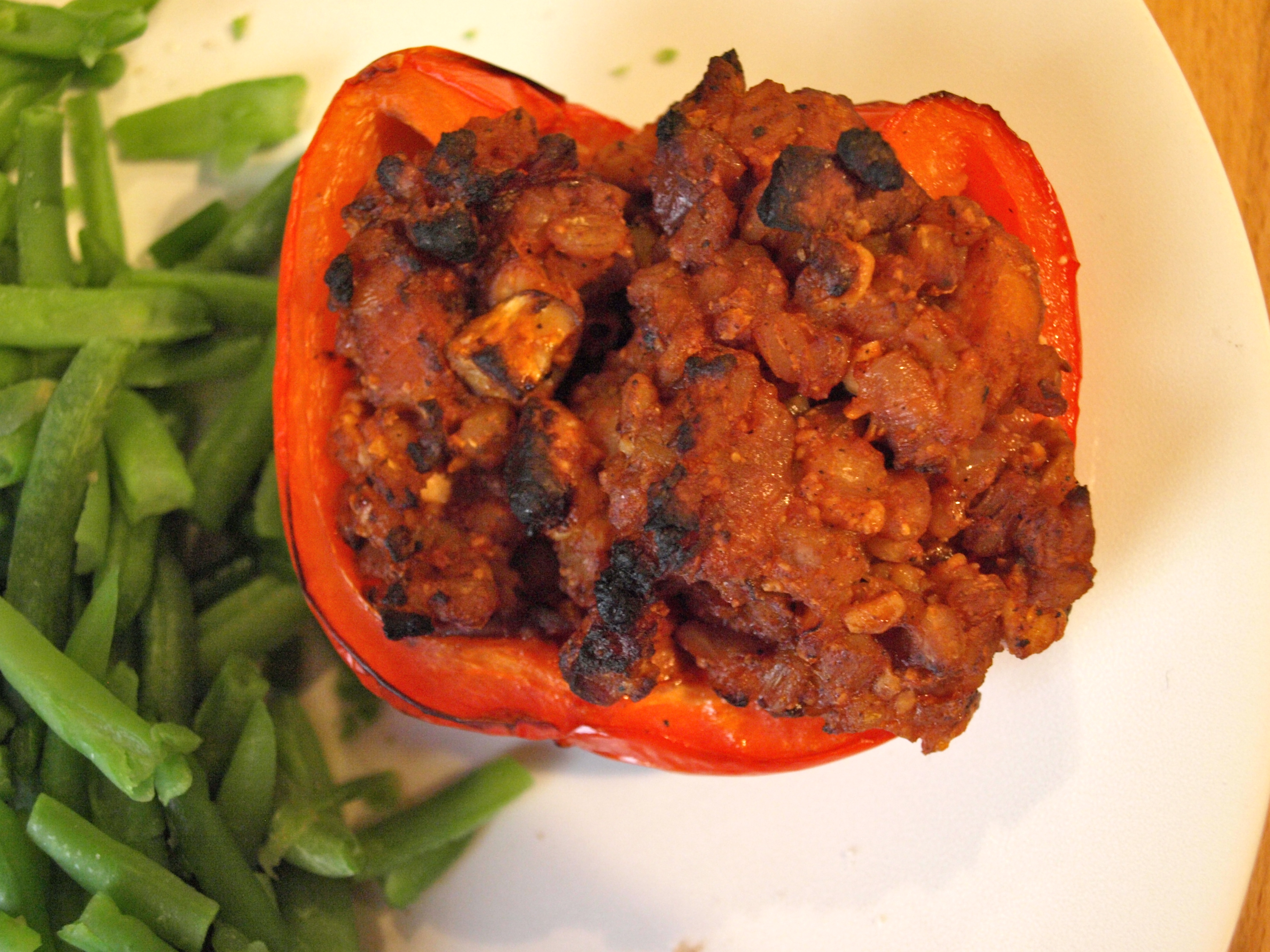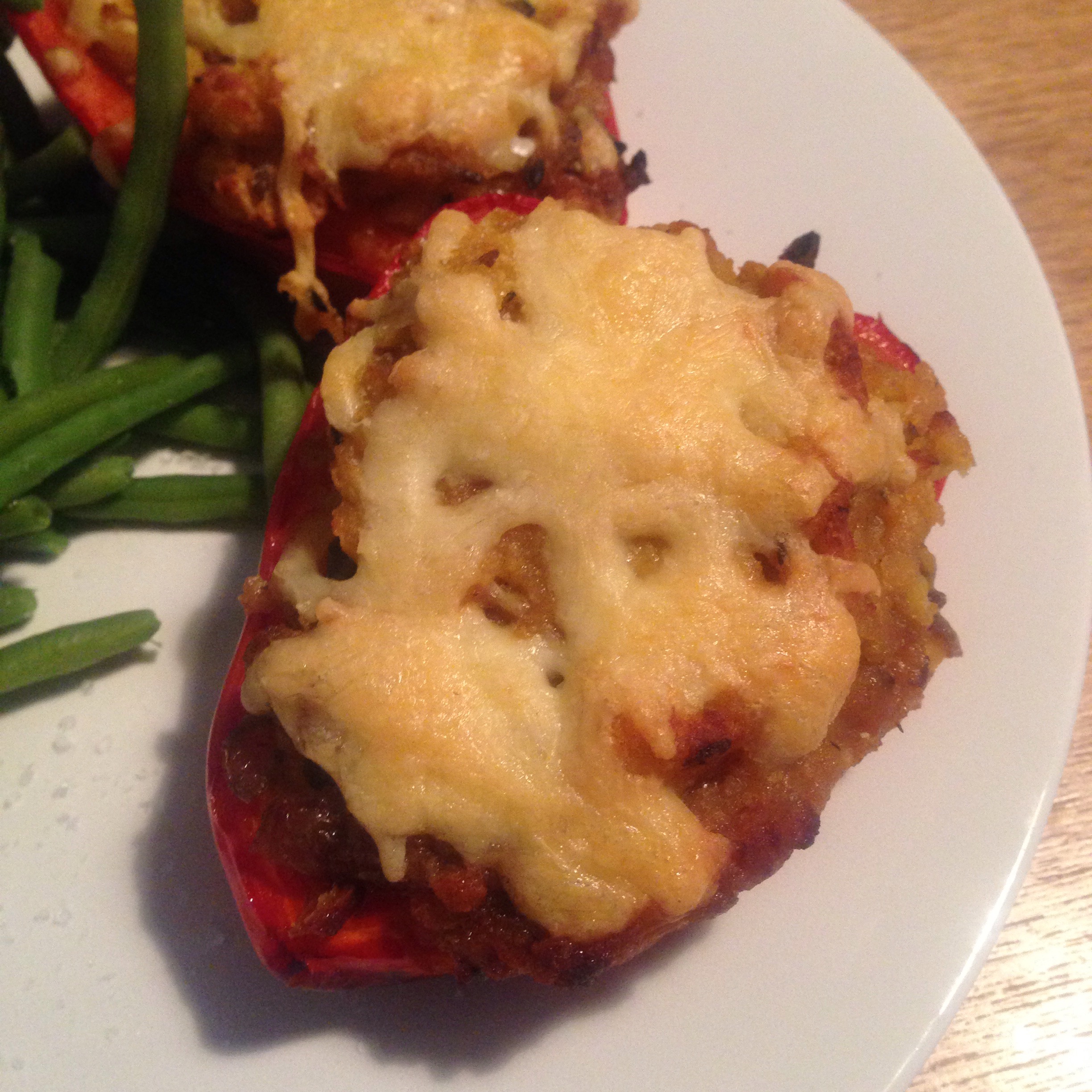 On the weekend, before I shop, I assess the state of the leftovers in the fridge and if there’s something to stuff a pepper with, then that’s one meal I don’t have to plan, I usually eat them with green beans. It’s such an easy way of sorting out dinner, I don’t know why I didn’t think of it before…