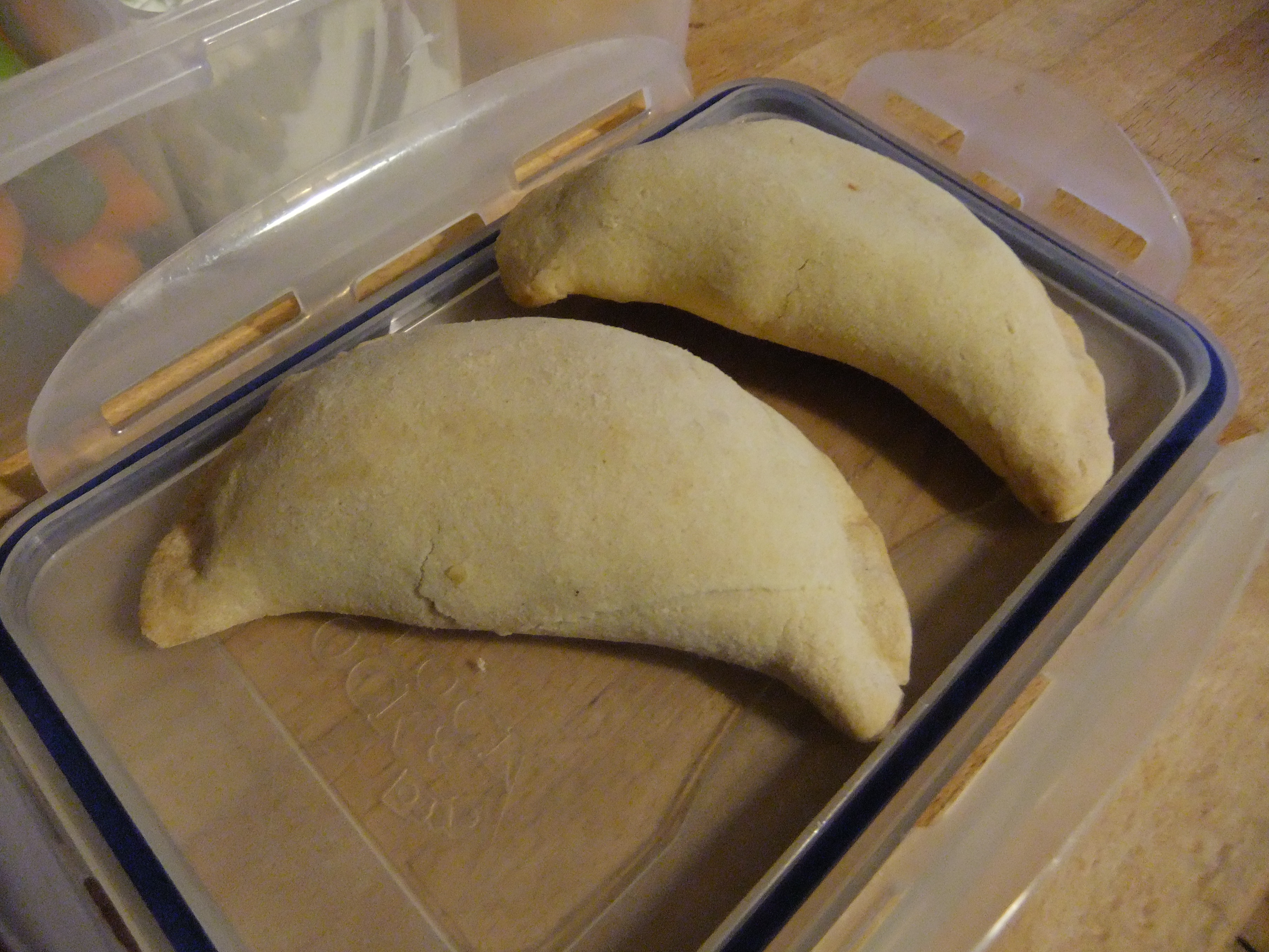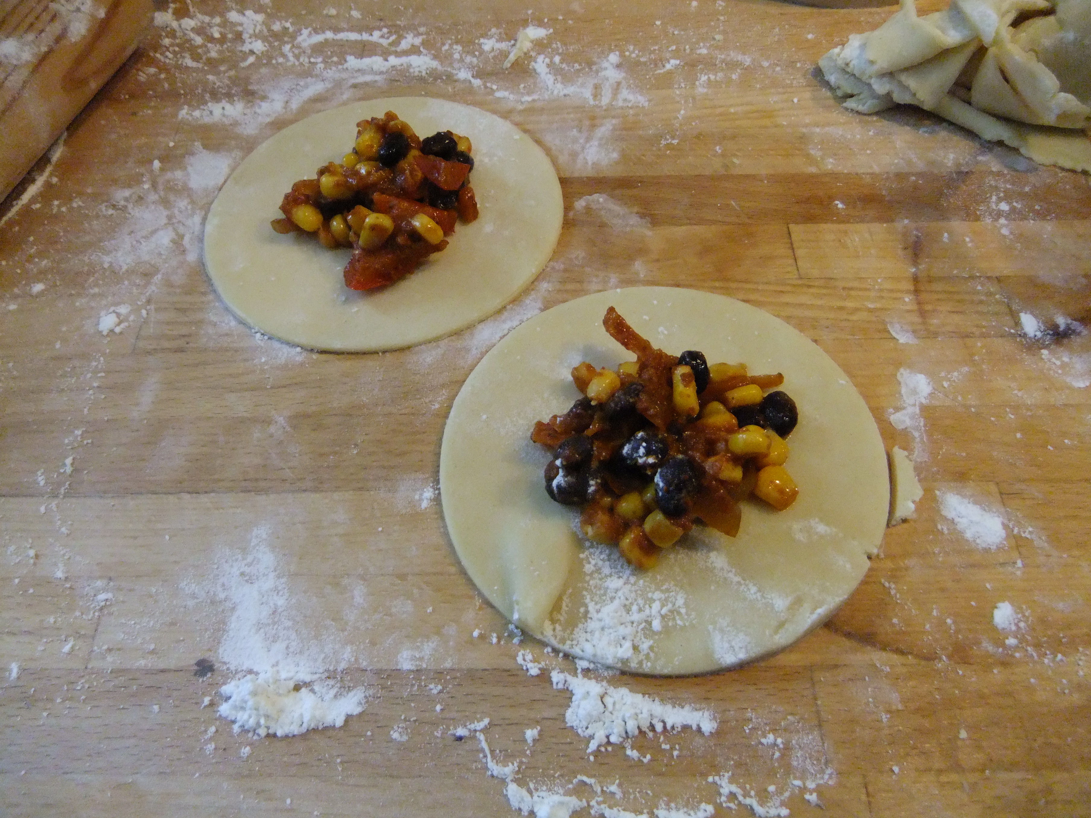 It makes quite a lot and is brilliant for leftovers. I eat it in tortillas as originally advertised, on top of baked potatoes, with rice as a sort of burrito bowl, stuffed in a pepper and once with pasta. On Sunday, there was some left and I needed to do something with it. So I made some simple shortcrust pastry (4oz of butter, 8oz plain flour, pinch of salt – whiz in a food processor, add water slowly until it clumps, remember the less water the better!) and made turnovers with the black bean and corn leftovers.