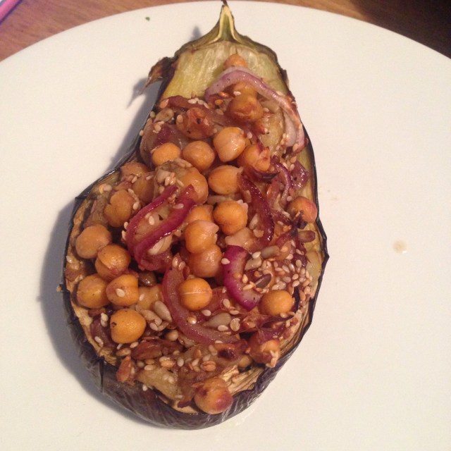 So I was surprised to see this recipe for stuffed aubergines because it’s such a Nic recipe, with two of my favourite staples, chickpeas and aubergines. I knew I was going to try it and I knew there were going to be some changes. First off, the recipe is for 2, rather than scale down everything, I just used one aubergine and used the leftover chickpea mix elsewhere (stuffed in a pepper, in a salad and by itself with a poached egg have been the approaches so far), I nixed the red chilli because I’m not keen on heat and I didn’t have one handy, lastly I used roughly 6 tablespoons of mixed seeds (pumpkin, sunflower, golden linseeds and sesame) rather than pumpkin and seasame specified in the recipe because I had a bag of those and necessity is the mother of all invention..