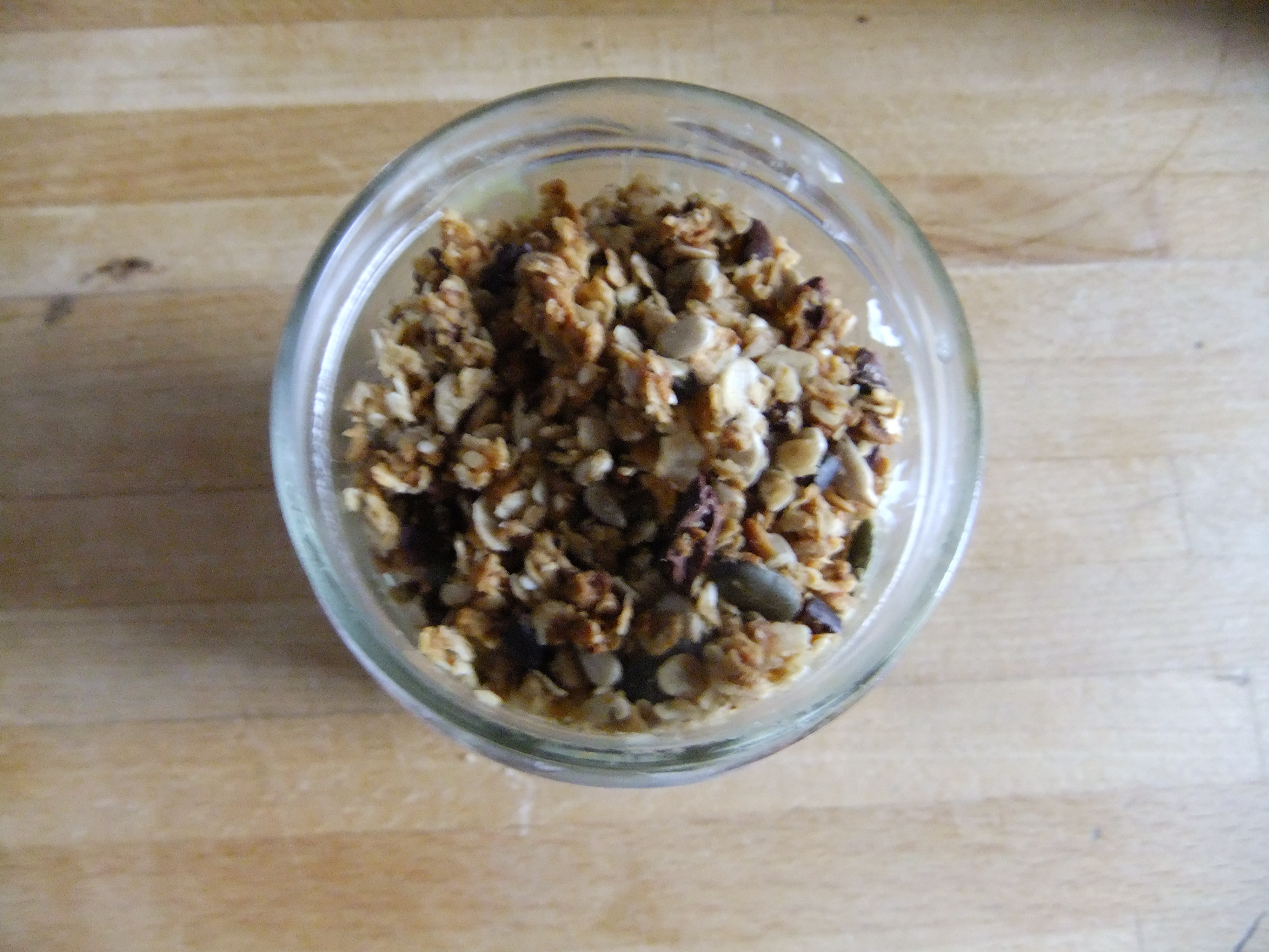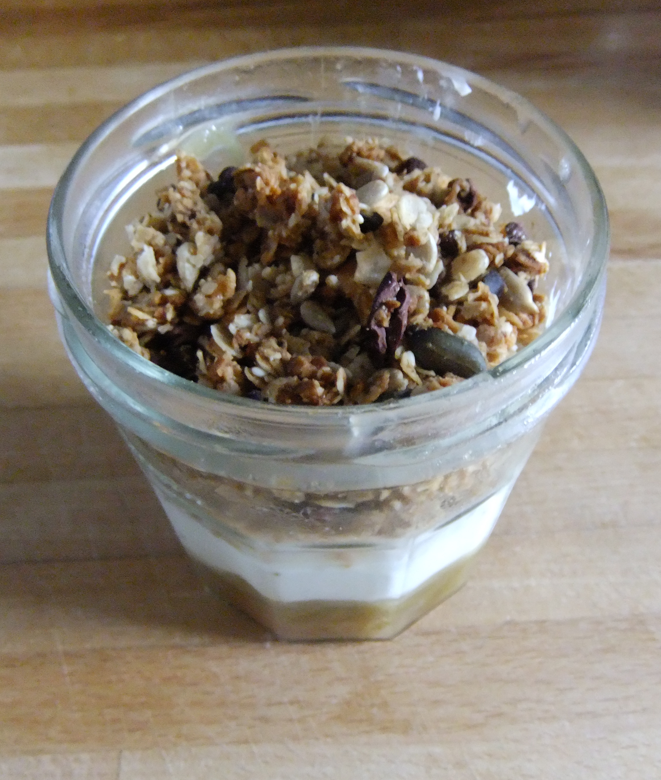 I took 450g rhubarb, to which I added 80g sugar, 2 tablespoons honey and 2 teaspoons of ground ginger. Over a medium heat, I let it cook until it had reduced down to a thick and jammy consistency, then into pots it went. As usual greek yoghurt went on top of that and my favourite granola on top of it. (I’ve noticed that the recipe for the granola has disappeared so I’ll get around to posting that sometime soon)