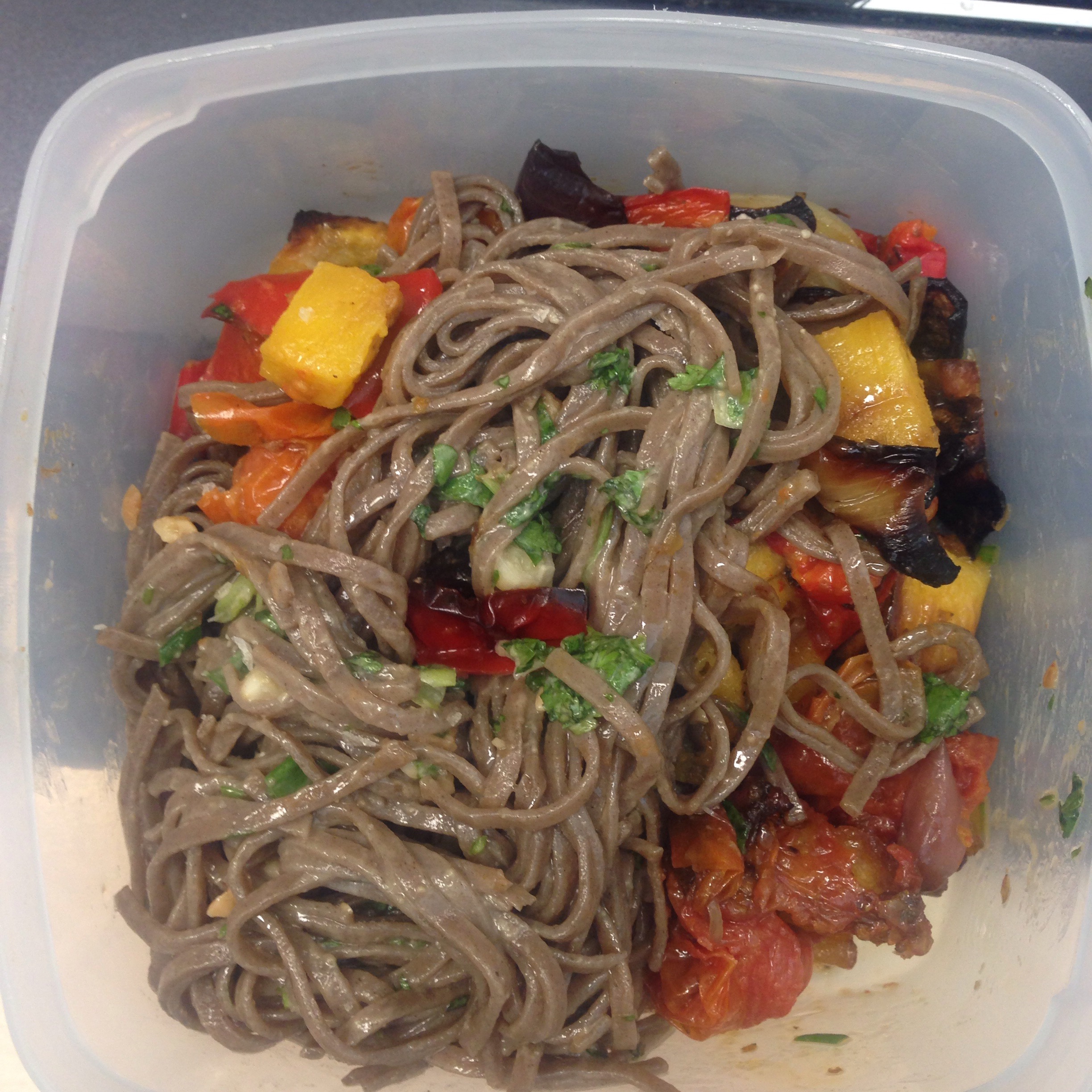 I portioned it up into five containers and added roasted vegetables because in the post Christmas slump, you can never have too many! That done it became the holy grail of packed lunches, easy to make, tasty, cheap (working out at less than .75p a portion) and interesting. I know that it doesn’t look like much but that it entirely down to my photography skills, at the office on my phone, which make it look like it could be a candidate for sad desk lunch but I promise you it’s not and it’s well worth looking at if you’re in a leftovers for lunch rut. You don’t have to use soba noodles either, you could try wholemeal or spelt spaghetti (which have the added bonus of being cheaper) just weigh out 9.5oz before you cook it.