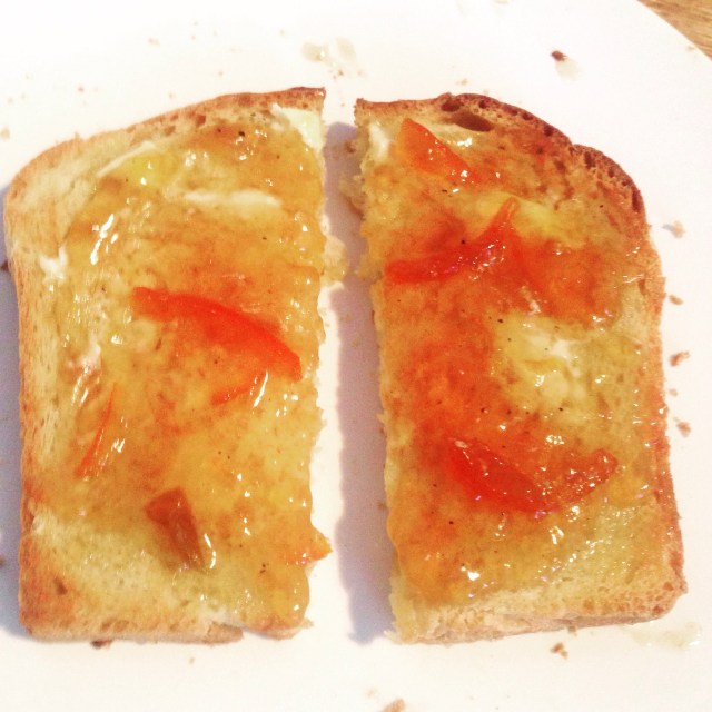 I felt that I hadn’t made marmalade properly and that I should at least do it once. One of the true joys of cooking is learning about what and how you like to cook and eat and also in learning what it is important for you to make from basic principles and what you are happy to buy from the shop. These things vary from person to person and change depending on what stage of life you are at but there is a rightness about knowing these things for yourself. There is also something lovely about the finiteness (is that a word?) of cooking and especially preserving that I love. The blackberry jam that I made last year is gone but the memory of Ma and I going out to pick them and then getting jam from that is still with us. Last year, I finished a rhubarb and ginger jam, that honestly was getting on a bit but it was the last jam I had that Tina had made and I will confess to hanging on to it because Tina had made it and I’ll never eat a jam she made again. There’s also the changeable nature of it, one year it will behave, one year it won’t, over the weekend Jen made her marmalade noted that this year the shred didn’t float all the way to the top like it had last. Or the year you do everything right and the stuff just won’t set for no earthly reason you can find. It’s happened, there was that plum jam that time….