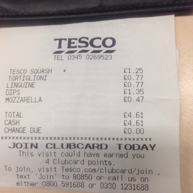 On Tuesday, I needed to go to the library and I wanted some guacamole for the corn and black bean tacos I was planning to cook (yeah, it’s sort of been tortilla central in my house this week). So I popped into Tesco and bought the tex-mex dips and my favourite brand of pasta was half price. As pasta had been on the torn up shopping list and I only had spelt spagetti, I bought linguine and tortiglioni. Finally, I bought mozzerella for FNP and some squash because water tasted funny!. I spent £4.61 and was done with 15p to spare.