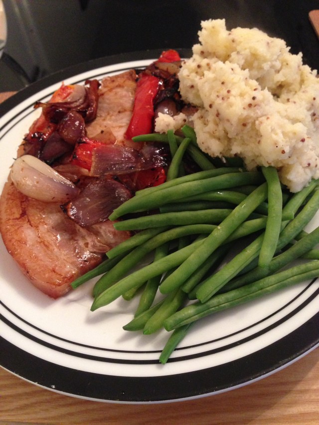 Monday night was a pork chop (they were massive) roasted with onions and peppers with mash and green beans.