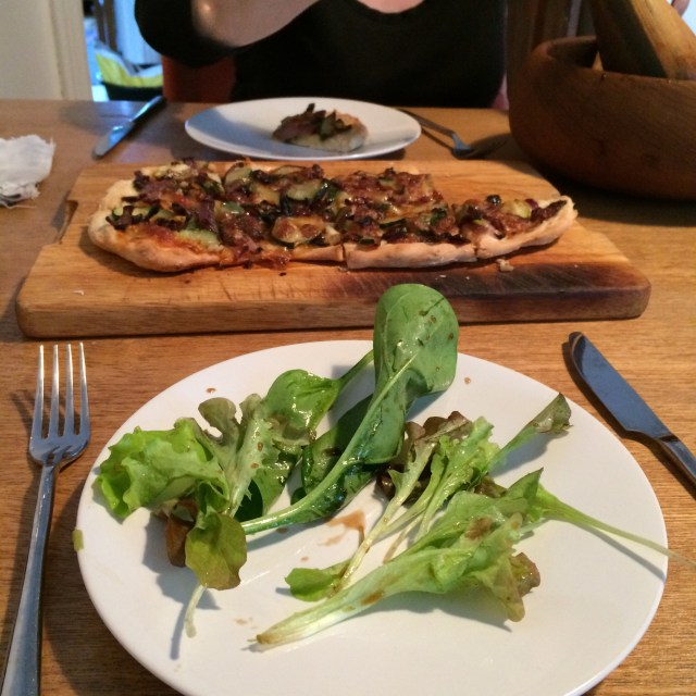 For Sunday lunch I made a sausage tart, loosely based off this recipe, with sage from the plot, we ate it with new potatoes, so a tick for carbs and protein but a black mark for complete lack of veg, I should have sauted the courgette! The leftover tart was lunch this week, with a chopped salad and rhubarb compote for pudding.