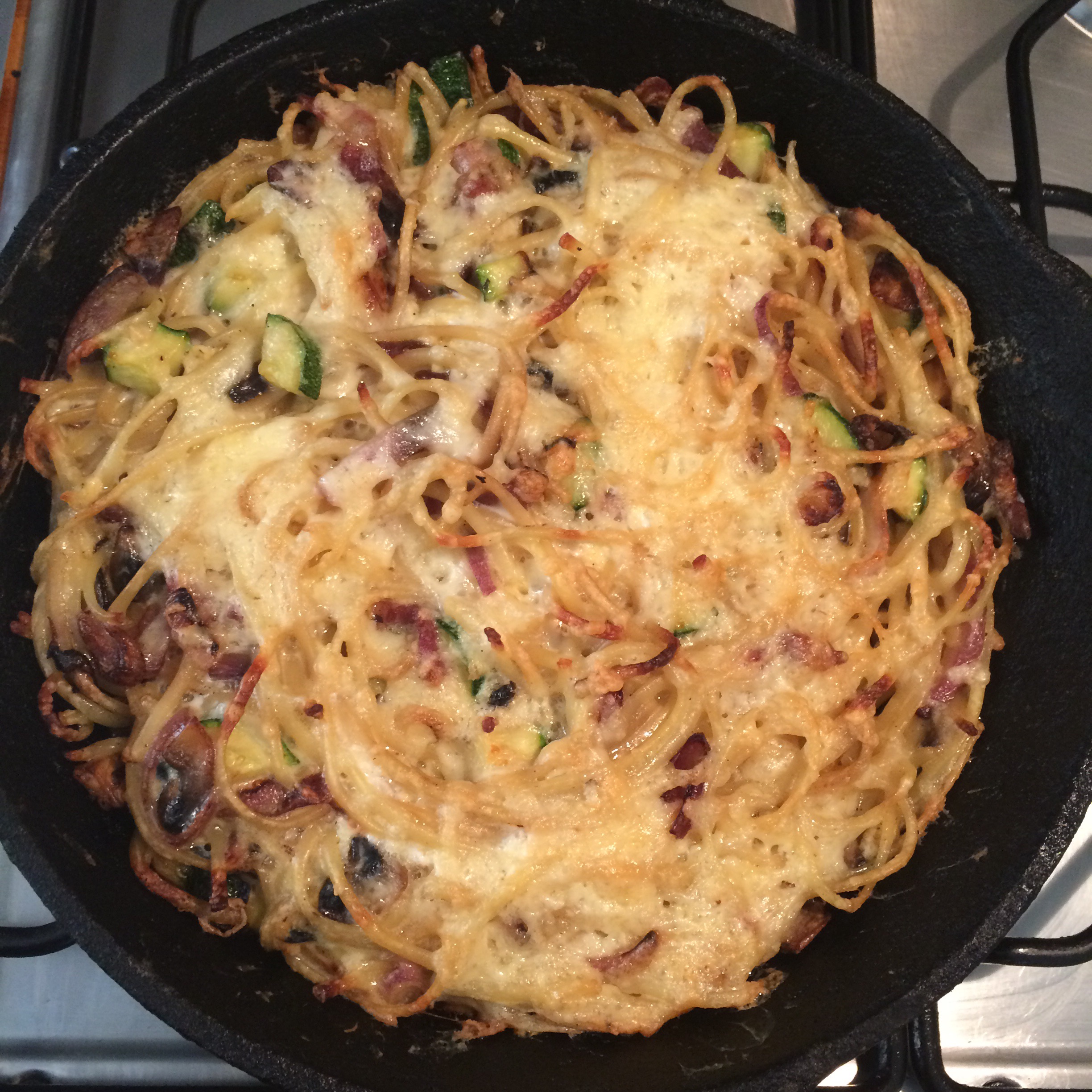 I used the leftover pasta from Friday and Monday to make a spaghetti frittata. There’s onion, courgette and mushrooms in there too. This was lunch for the rest of the week.