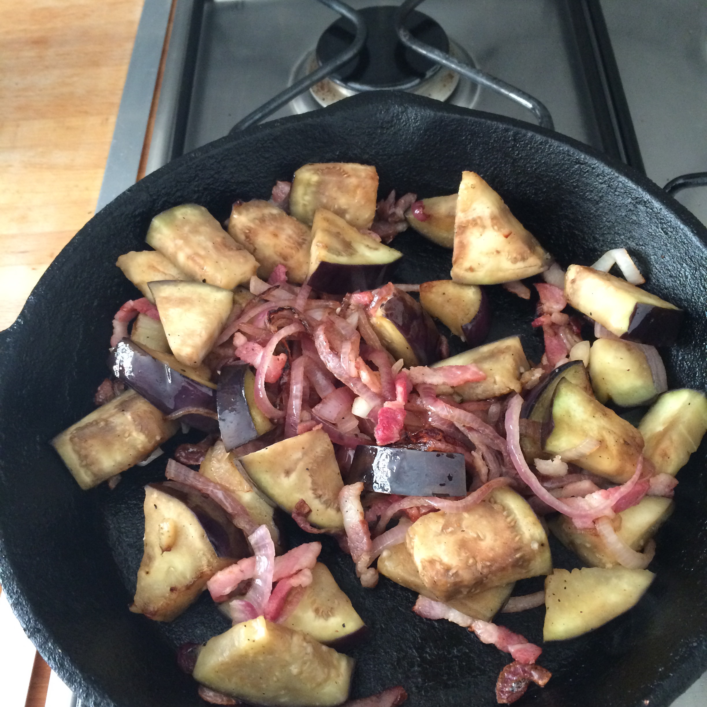 Thursday was a difficult work day, and I just didn’t have the energy, so I sauted aubergine and onions with some bacon and ate that.
