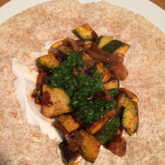 Monday was onions, courgettes, mushrooms in a tortilla with pesto