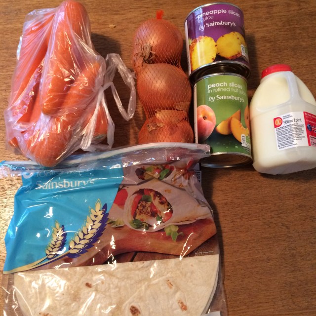 Last weekend, I wasn’t home and this shop was done in the Sainsburys local on Sunday evening. It came to £6.14. Later in the week, I also bought some parmesan, pasta, and lemons which came to £5.40 (£2.20 of that was lemons for honey and lemon!). So a total of £11.54.