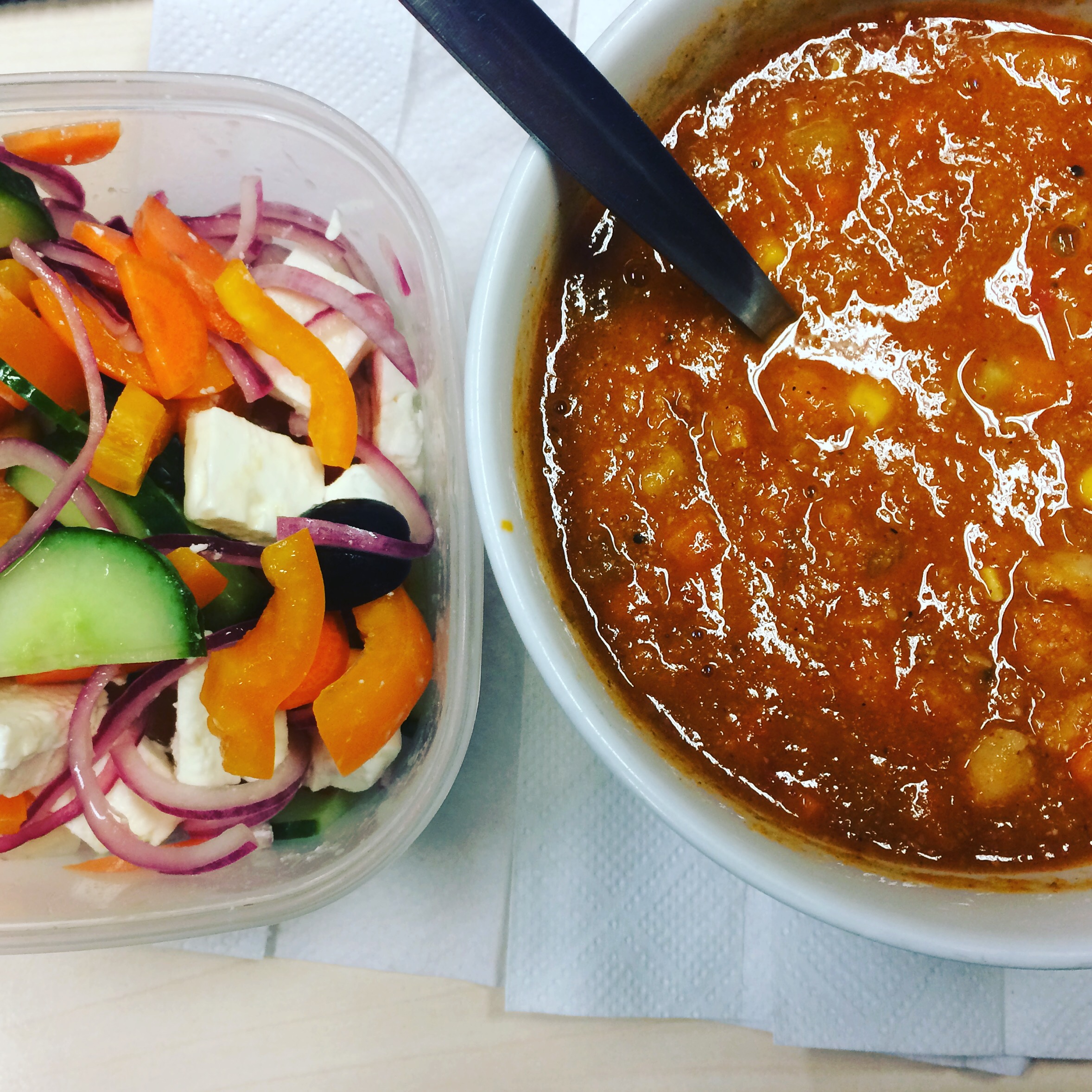 Lunch was chickpea soup and a salad (pepper, carrot, cucumber, olives and quick pickled red onion)