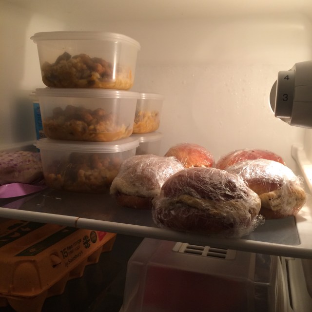 Which is why on Sunday night my fridge contained all my lunches and breakfast for this week and why they are all the same thing. Lunches are leftovers from Saturday night, dahl, rice and chana masala and flatbreads. Breakfast will be an egg roll. All of this can be heated up in a microwave at the office and I chopped a load of carrots and peppers to go with it. This week the only cooking I’ve had to do has been dinner.