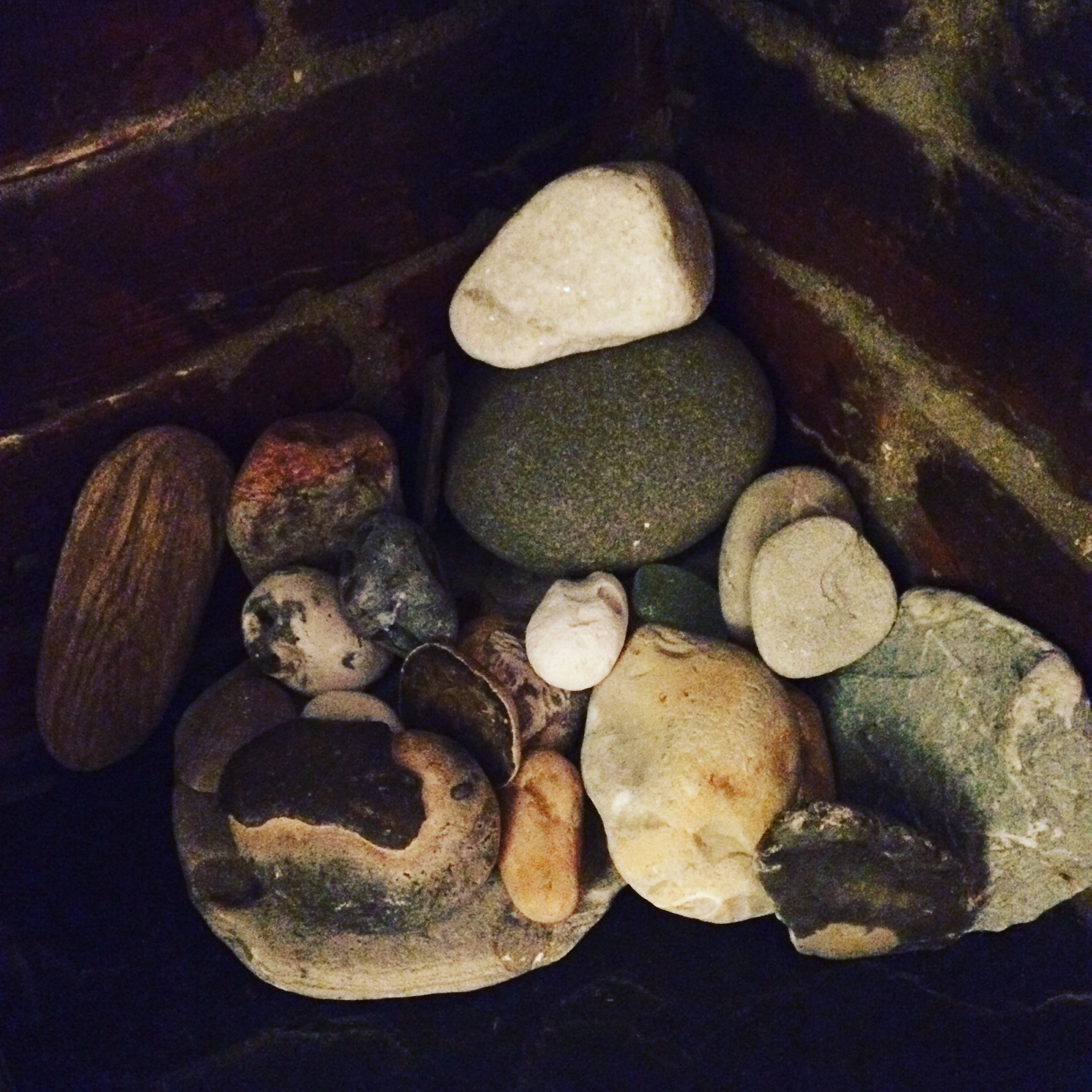 Fireplace stones. 12 January. Christina wrote a piece about stone collecting. She tells me that I’m doing it wrong because my stones are touching. I know I’m doing it wrong because some of that pile is driftwood and there’s some incense in there too