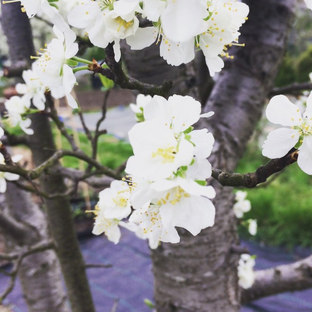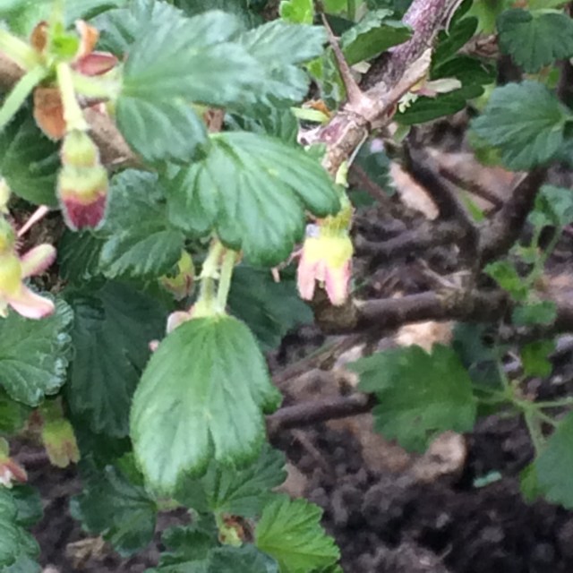 The gooseberries have flowers and the plum tree is in blossom.