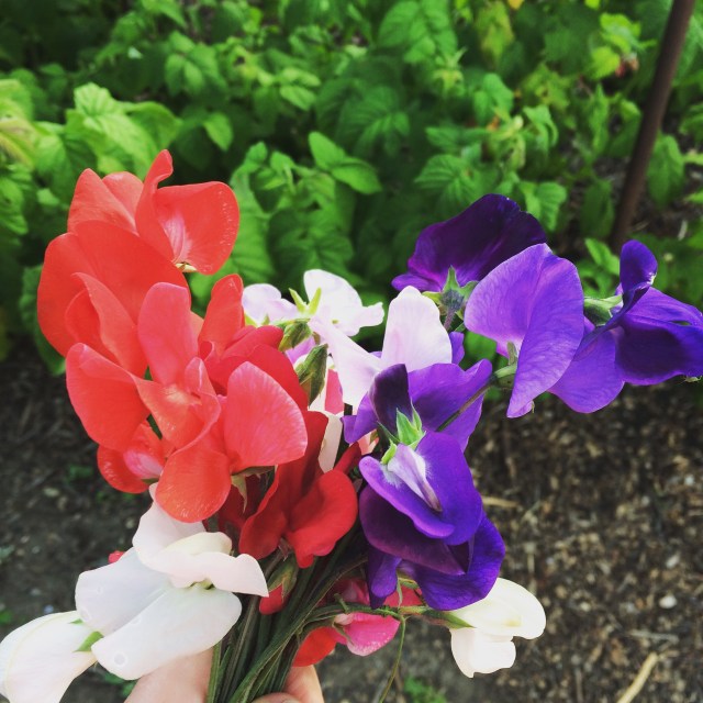 We also watered and fed everything. It doesn’t look like much but it was four hours in the very hot heat. We finished by picking more sweet peas, raspberries, salad and my first cucumber!