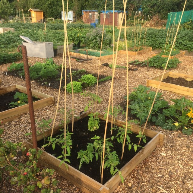 This year, there are three tomato beds, one cucumber bed, a courgette bed, a crookneck, a patty pan, 4 winter squash, two pea pyramids, two sweet pea pyramids, two leek beds, a bigger salad bed, an old bath with carrots and spring onions, a bed of french beans, the brassica bed which has broccoli and cavolo nero and french beans in it and a bag of potatoes. Also because it’s been so dry the raspberries and rhubarb need watering. There’s a hell of a lot more to water…