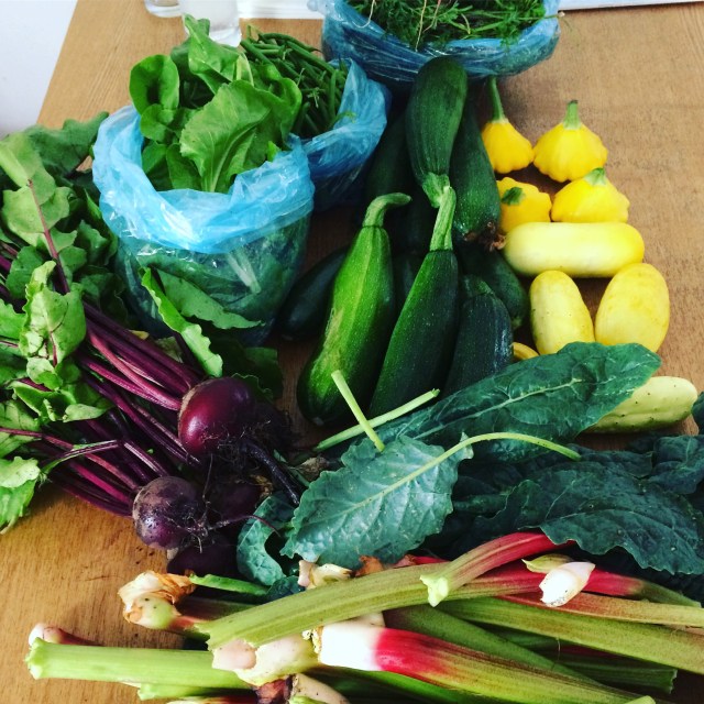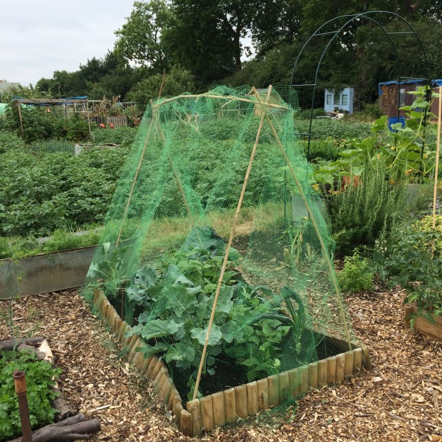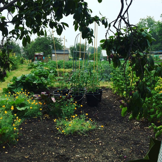 Aphids are also the reason for the massive pick of rhubarb, did you know that rhubarb can get aphids, nope I didn’t either. But I stripped the plant and am now drowning ants on it on a regular basis. We pulled up sweetpeas next to the greenhouse because they got greenfly. The french beans have aphids too and the cucumbers have mildew. I’m a wreck of worry because I’m I am worried about tomato blight and why the patty pan has yet to produce one fruit (the ones in the produce photo are gifts from a plot neighbour.) Then Ma points out that the carrots are ok, we’ve had over two kilos of beans from three rows of plants (half a bed), that the crookneck plant is doing well, that the butternut squash plant has six squash and is a monster, that we had blight last year and got tomatoes, that we grew beetroot, that the leek and salad beds are fine, that the cucumbers are still producing, there was even kale this week and “really Nic, you just need to stop being so negative”.Easy for her to say, she ate the first ripe tomato! However, she’s right, she often is, so here are the produce pictures from last week (minus that tomato!)On Monday, I sent Kathy home with a courgette, a cucumber and a crookneck, some parsley and basil. The plums are almost ready as are the tomatoes and I need to stop being so anxious about it (especially given that yesterday I was just talking about the problem of expecting perfection!)So last weekend, we weeded, we watered, we picked and we built a new brassica cage.We also viewed the rain from the shed while having a cup of teaIt’s all ok. Some of it will go wrong and that’s ok too.