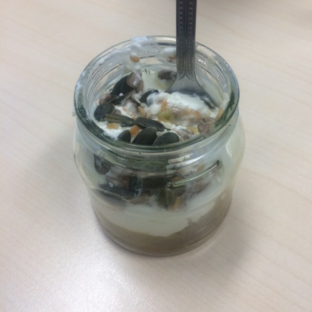 Desk breakfast of rhubarb compote, with strained yoghurt and seeds. This is my standard grab and go breakfast, and the one I always return too, this week without granola because I’m out and couldn’t bear having the oven on. I set them up at the beginning of the week and it’s one less thing to worry about. The secret to making these filling is to use greek yoghurt or to do what I do and strain plain yoghurt.