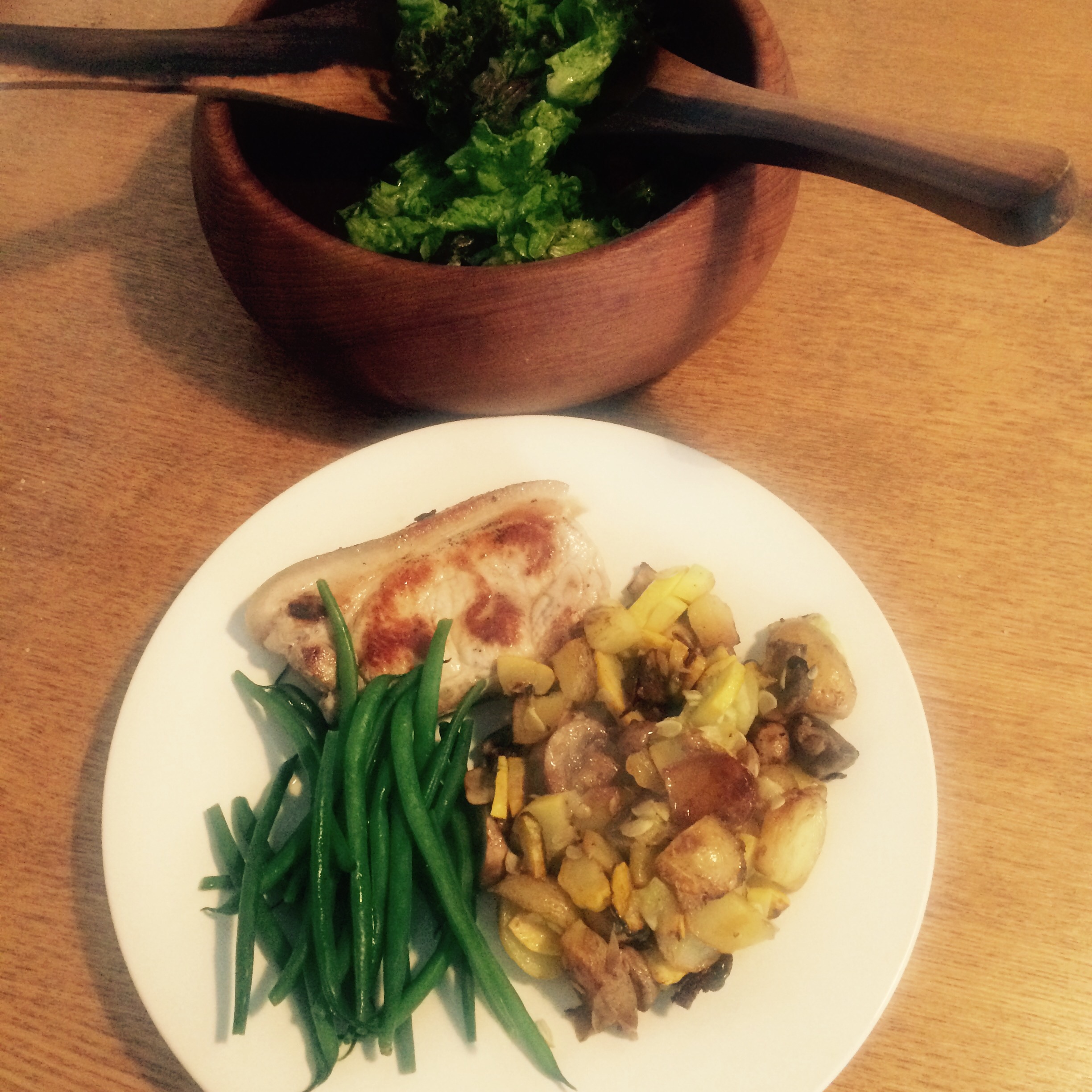Pork chop, potato hash and green beans with a side salad because I can. Simple easy and delicious