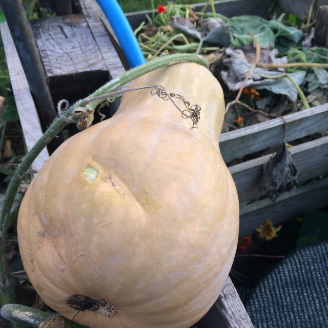 Managing to move the butternut squash from the pallet where it had wedged itself to the top of the pallet where it can get some sun.