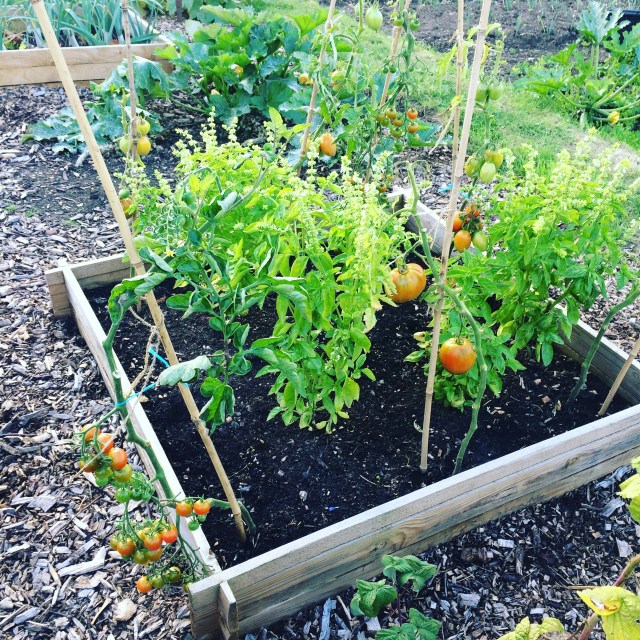So we’re still keeping ourselves fed, but two of the tomato beds are done. The early bed with the orange tomatoes, is more or less exhausted and we pulled up the cherry tomato bed next to the herb bed because the blight was spreading faster than the tomatoes were ripening (it’s a fine line). So they came up and we harvested all the basil in that bed too.