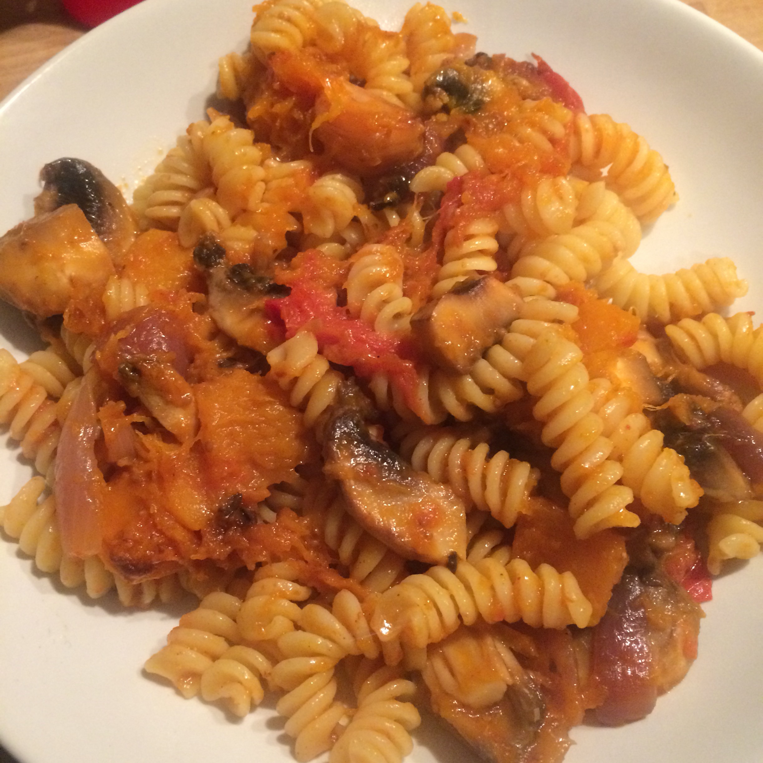 Chicken and roasted vegetables, (onions, tomatoes, garlic and my last butternut squash from last season)